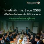 ในการประชุมกนง. วันที่ 8 ต.ค. 2568 ที่ผ่านมา กนง. มีมติไม่เป็นเอกฉันท์ 5 ต่อ 2 เสียงให้คงดอกเบี้ยนโยบายที่ 1.50% ตามที่ศูนย์วิจัยกสิกรไทยคาดไว้ก่อนหน้านี้ โดย 2 เสียงเห็นควรให้ปรับลดดอกเบี้ยนโยบาย 0.25% เพื่อสนับสนุนเศรษฐกิจและบรรเทาภาระหนี้ โดยมีรายละเอียดดังต่อไปนี้