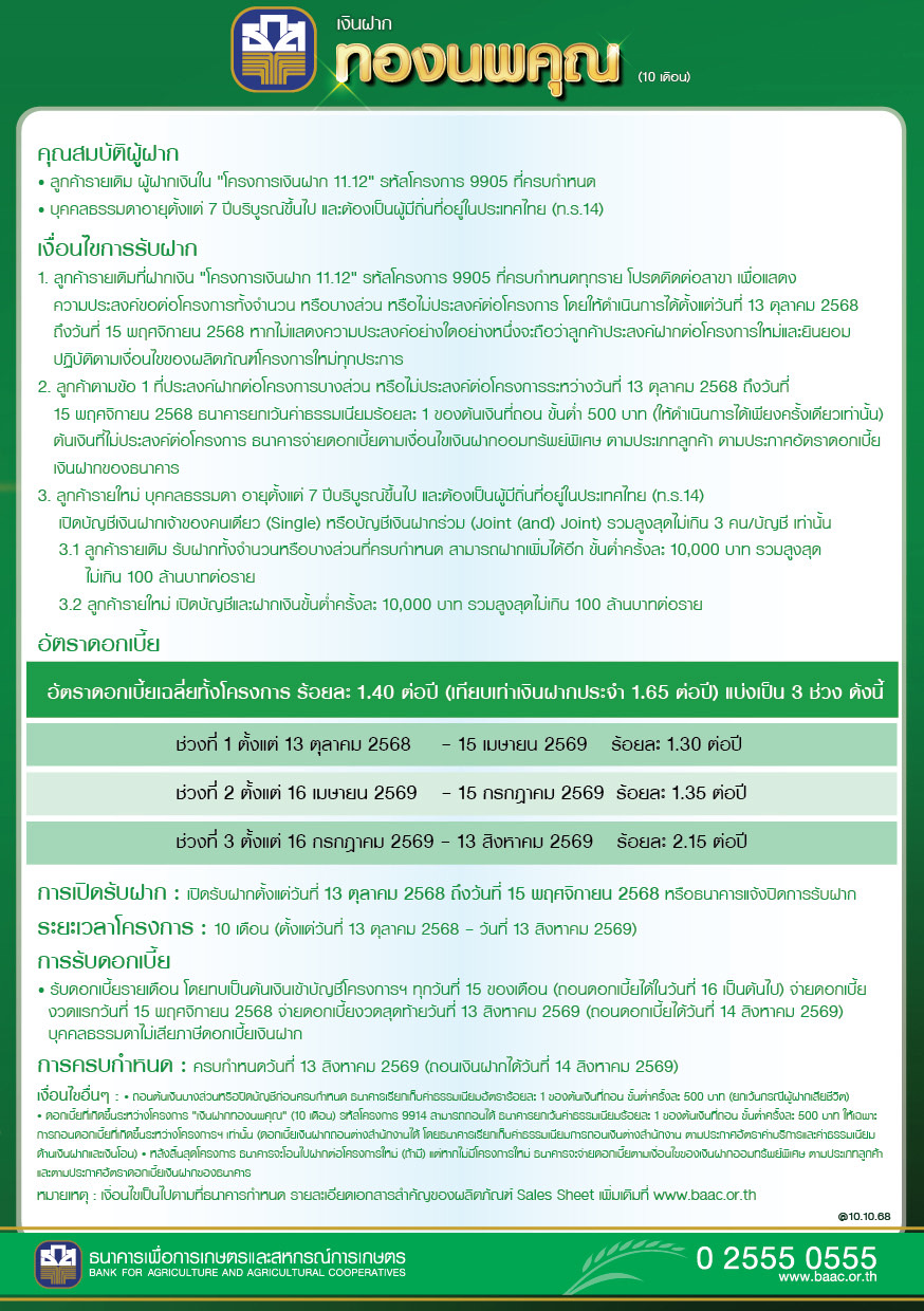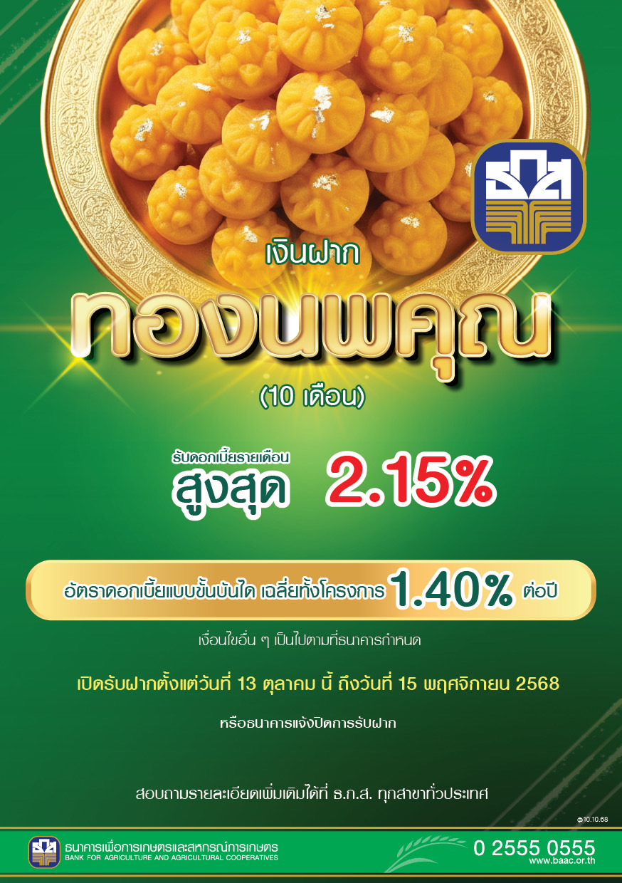 ธ.ก.ส.เปิดตัว "เงินฝากทองนพคุณ" ฝากขั้นต่ำครั้งละ 10,000 บาท วงเงินฝากรวมสูงสุดไม่เกิน 100 ล้านบาทต่อราย รับดอกเบี้ยทุกเดือนแบบขั้นบันได สูงสุดถึงร้อยละ 2.15 ต่อปี เฉลี่ยทั้งโครงการร้อยละ 1.40 ต่อปี ระยะเวลาฝาก 10 เดือน เปิดรับฝากที่ ธ.ก.ส. ทุกสาขาทั่วประเทศ ตั้งแต่วันที่ 13 ตุลาคม 2568 ถึง 15 พฤศจิกายน 2568