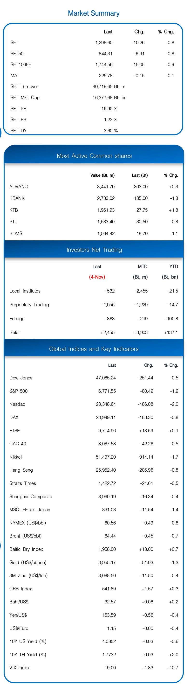 อ่อนลงต่อ – ปัญหาชัตดาวน์สหรัฐฯ ที่ยาวนานทำสถิติใหม่ สร้างความกังวลจะกระทบต่อศก.มากขึ้น ประกอบกับราคาหุ้นทั่วโลกที่ปรับตัวขึ้นมากตั้งแต่ต้นปี โดยเฉพาะหุ้นกลุ่มเทคที่มีระดับการประเมินมูลค่าอยู่ในระดับสูงกระตุ้นแรงขายล็อกกำไรระยะสั้น ด้านเทคนิค SET หลุด 1300 เป็นสัญญาณเตือนที่ไม่ดี แนวรับ 1290, 1280 แนวต้าน 1310-15