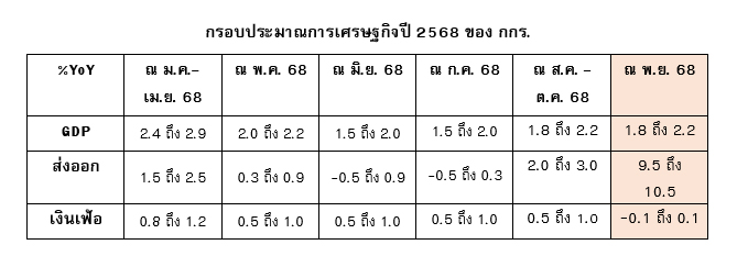 • คาดเศรษฐกิจไทยปี 2568 มีแนวโน้มขยายตัวได้ที่ 1.8%-2.2% ตามที่ประเมินไว้เดิม แม้การส่งออกอาจโตได้ประมาณ 9.5%-10.5% แต่เป็นสินค้าที่มี local content ต่ำมาก และทองคำซึ่งไม่ได้สร้างมูลค่าเพิ่มให้เศรษฐกิจจริง ประกอบกับการนำเข้าที่ขยายตัวสูงถึง 10.2% ขณะที่เงินเฟ้อต่ำเพียงราว -0.1% ถึง 0.1% ตามราคาพลังงานที่แผ่วลง อย่างไรก็ดีหากสามารถเร่งรัดการเบิกจ่ายงบประมาณปี 2569 ควบคู่ไปกับมาตรการกระตุ้นเศรษฐกิจคนละครึ่งพลัส สนับสนุน SMEs และ Made In Thailand ตามแนวทาง Quick Big Win ของรัฐบาล จะเป็นแรงสนับสนุนสำคัญของเศรษฐกิจไทยในปี 2568 ให้โตได้ใกล้เคียงกับปีก่อนที่โต 2.5%