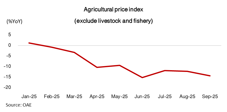 • ราคาพลังงานปรับลดลงตามราคาในตลาดโลกและมาตรการลดภาระค่าครองชีพของรัฐบาล โดยมีส่วนทำให้เงินเฟ้อลดลง (contribution to inflation) -1.37%YoY โดยตั้งแต่วันที่ 4 ต.ค. 2568 รัฐบาลประกาศปรับลดราคาน้ำมันเชื้อเพลิงในประเทศลง 50 สตางค์ต่อลิตร ส่งผลให้ราคาน้ำมันดีเซลปรับลดลง - 4.9%YoY และแก๊สโซฮอลล์ปรับลดลง -11.1%YoY