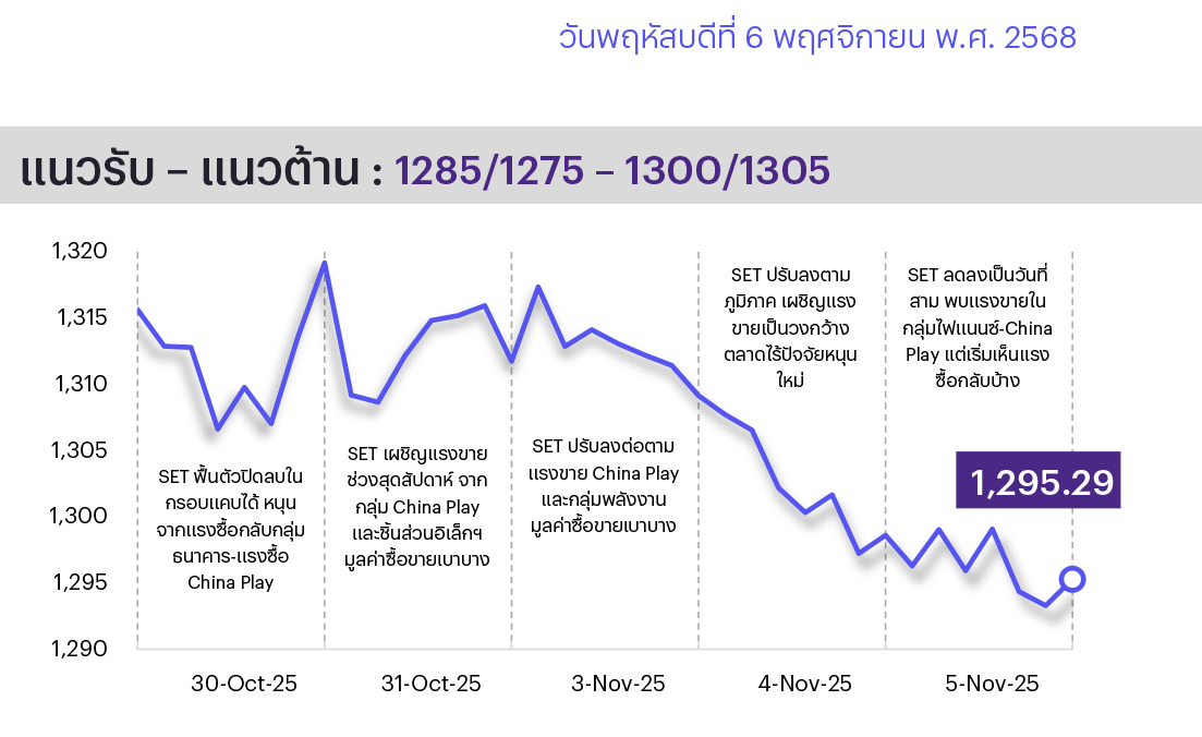 ช่วงสั้นมอง SET จะแกว่งตัวไซด์เวย์ในกรอบ 1280-1345 จุด ปัจจัยในประเทศติดตามการเข้าสู่ฤดูกาลประกาศงบ 3Q68 ของ บจ. กลุ่ม Real Sector หลังงบหุ้นธนาคารส่วนใหญ่ออกมาดีกว่าตลาดคาด และการออกมาตรการกระตุ้นเศรษฐกิจเพิ่มเติมของรัฐบาล อาทิ มาตรการช่วยเหลือลูกหนี้รายย่อย โดยจะรับซื้อหนี้ที่ไม่มีหลักประกันและค้างชำระไม่เกิน 1 แสนบาทต่อราย ขณะที่เงินเฟ้อไทย ต.ค. 2568 ติดลบมากกว่าที่ตลาดและเราคาดไว้ ปัจจัยภายนอกที่ต้องติดตาม ได้แก่ 1) ตัวเลขเศรษฐกิจสหรัฐฯ เช่น การจ้างงาน ดัชนี PMI ภาคการผลิตและภาคบริการ และดุลการค้า ต.ค. 2568 หากออกมาแย่ ตลาดจะให้น้ำหนักเฟดจะปรับลดดอกเบี้ยลงต่อใน ธ.ค. นี้ 2) การประชุม BoE คาดมีมติคงดอกเบี้ยนโยบาย และ 3) งบ 3Q68 ของ บจ. ขนาดใหญ่ของสหรัฐฯ ที่คาดจะดีกว่าตลาดคาด ดังนั้นกลยุทธ์ลงทุนจึงแนะนำให้ “Selective Buy”