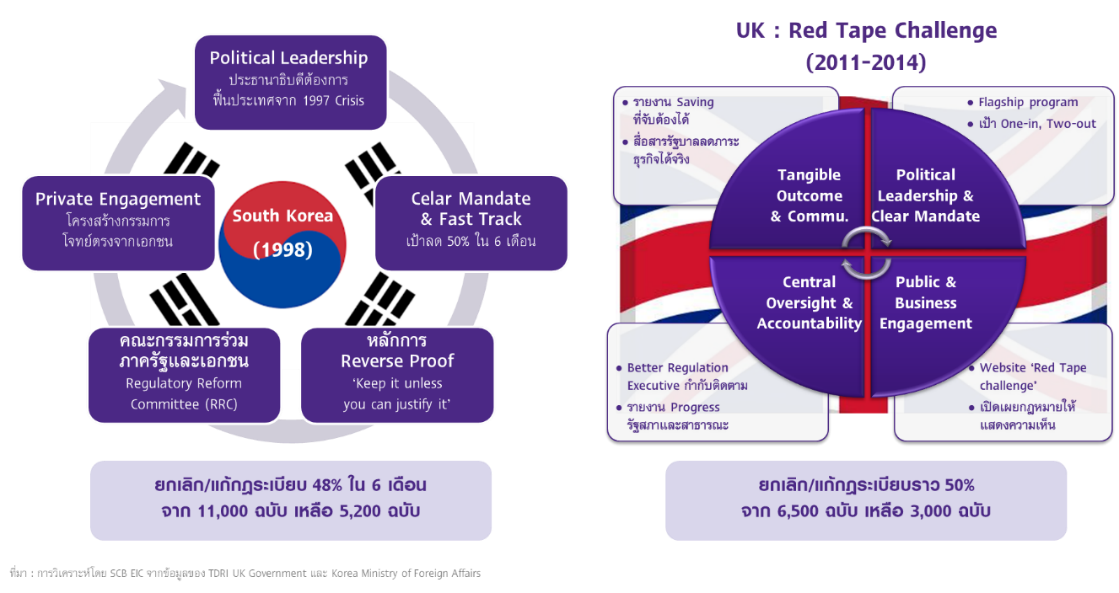 ปัญหา Regulatory reform ไม่ใช่เรื่องใหม่ของไทย รัฐบาลที่ผ่านมาต่างตระหนักถึงปัญหานี้และพยายามปฏิรูปกฎเกณฑ์ภาครัฐเพื่ออำนวยความสะดวกให้ภาคธุรกิจมาอย่างต่อเนื่อง อย่างไรก็ดี การปฏิรูปยังไม่ค่อยเห็นผลเป็นรูปธรรม เพราะไทยขาดผู้นำที่มุ่งมั่นจริงจัง ขาดเจ้าภาพหลัก ขาดแรงจูงใจในระบบราชการให้เปลี่ยนแปลงตัวเอง และขาดความต่อเนื่องทางการเมือง ประเทศที่ปฏิรูปกฎเกณฑ์ภาครัฐได้สำเร็จ เช่น เกาหลีใต้ สหราชอาณาจักร และเวียดนาม ต่างมีปัจจัยร่วม คือ ผู้นำตั้งเป้าหมายปฏิรูปครั้งใหญ่และกำหนดกรอบเวลาชัดเจน การตั้งเจ้าภาพกลางที่มีอำนาจกำกับติดตาม การออกแบบระบบติดตามความคืบหน้าที่โปร่งใส รวมถึงการเปิดให้ภาคเอกชนและภาคประชาสังคมมีส่วนร่วมให้ข้อมูลเพื่อปรับปรุง