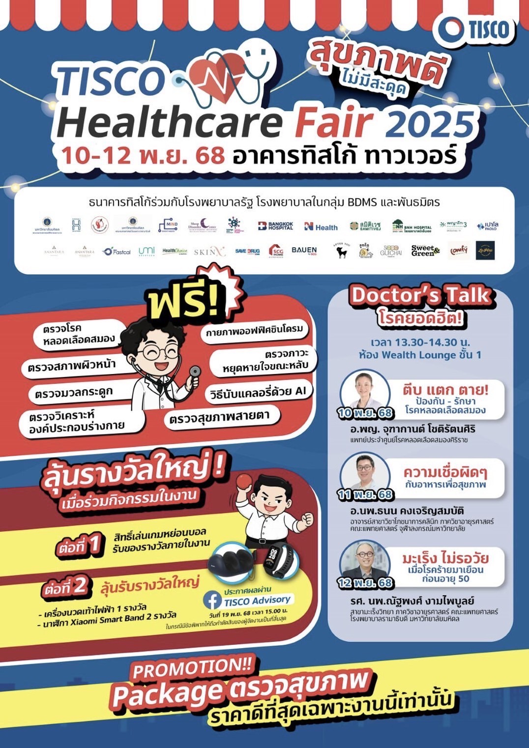 ธนาคารทิสโก้ จำกัด (มหาชน) ร่วมกับพันธมิตร Friends for Well-being กว่า 28 หน่วยงาน ทั้งโรงพยาบาลรัฐฯ โรงพยาบาลในกลุ่มบริษัท กรุงเทพดุสิตเวชการ จำกัด (มหาชน) (BDMS) พร้อมด้วยภาคธุรกิจพันธมิตรด้านที่อยู่อาศัย โรงแรม และร้านอาหารชั้นนำ จัดงาน “TISCO Healthcare Fair 2025” สุขภาพดีไม่มีสะดุด เชิญผู้สนใจร่วมกิจกรรมตรวจสุขภาพเบื้องต้น ฟรี ! พร้อมรับฟังสัมมนาให้ความรู้การป้องกันและรักษาโรคหลอดเลือดสมอง โรคมะเร็ง และการทานอาหารที่ถูกต้อง นอกจากนี้ ยังมีกิจกรรมให้ร่วมสนุกลุ้นรับรางวัลต่าง ๆ และนำเสนอแพ็กเกจตรวจสุขภาพราคาพิเศษ งานจัดขึ้นวันที่ 10 – 12 พฤศจิกายน 2568 ตั้งแต่เวลา 10.00 - 15.00 น. ณ อาคารทิสโก้ทาวเวอร์ ถนนสาทรเหนือ แขวงสีลม เขตบางรัก กรุงเทพฯ รายละเอียด คลิก https://link.tisco.co.th/cz8MRR