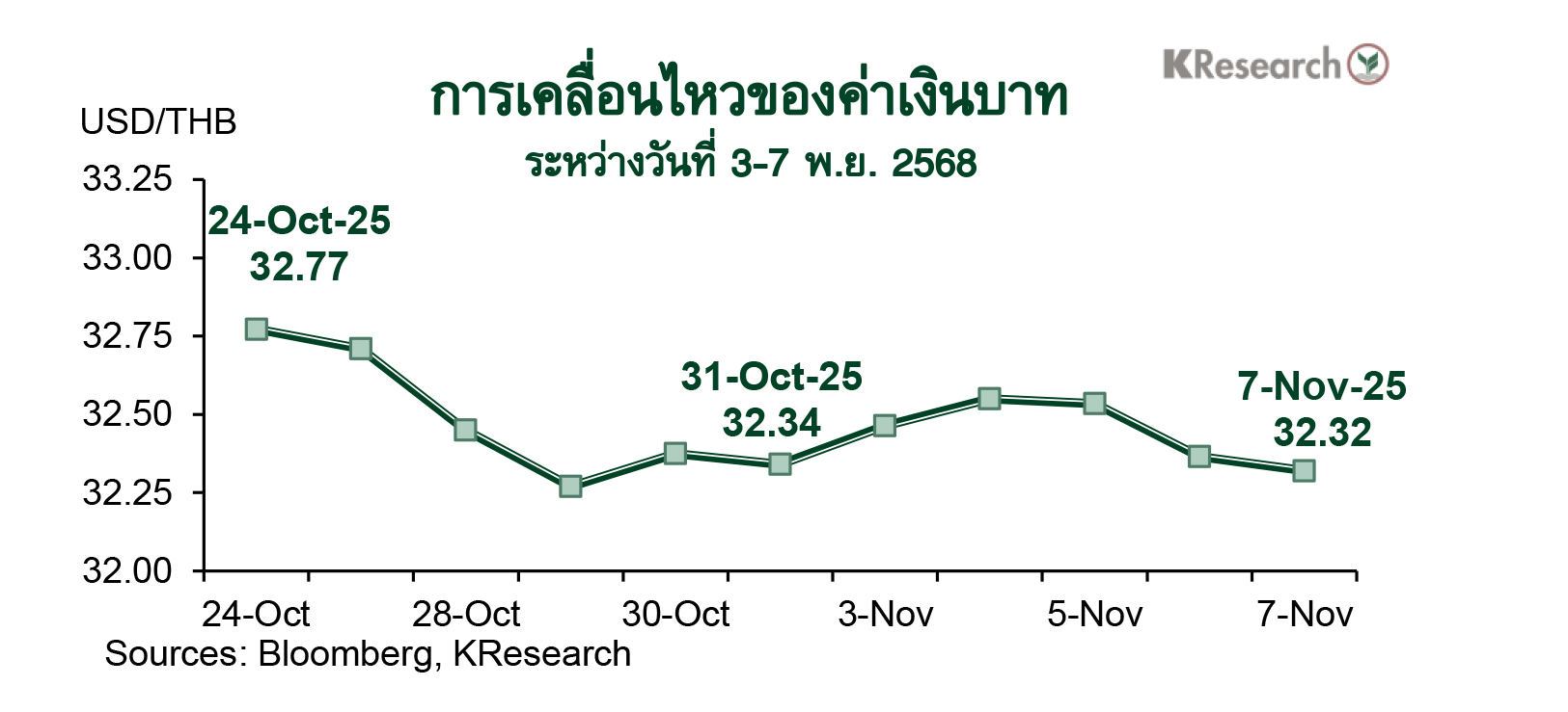 · สัปดาห์ระหว่างวันที่ 10-14 พ.ย. 2568 ธนาคารกสิกรไทยมองกรอบการเคลื่อนไหวของค่าเงินบาทที่ระดับ 32.10-32.80 บาทต่อดอลลาร์ฯ ขณะที่ศูนย์วิจัยกสิกรไทยประเมินปัจจัยสำคัญที่ต้องติดตาม ได้แก่ ฟันด์โฟลว์ของต่างชาติ ทิศทางค่าเงินเอเชียและราคาทองคำในตลาดโลก ส่วนปัจจัยต่างประเทศอื่น ๆ ที่ต้องติดตาม ประกอบด้วย สถานการณ์การชัตดาวน์ของสหรัฐฯ และถ้อยแถลงของเจ้าหน้าที่เฟด นอกจากนี้ ตลาดยังรอติดตามตัวเลขจีดีพีไตรมาส 3/2568 ของยูโรโซน และเครื่องชี้เศรษฐกิจจีนเดือนต.ค. (อาทิ ยอดปล่อยกู้ใหม่สกุลเงินหยวน การผลิตภาคอุตสาหกรรมและยอดค้าปลีก) ด้วยเช่นกัน