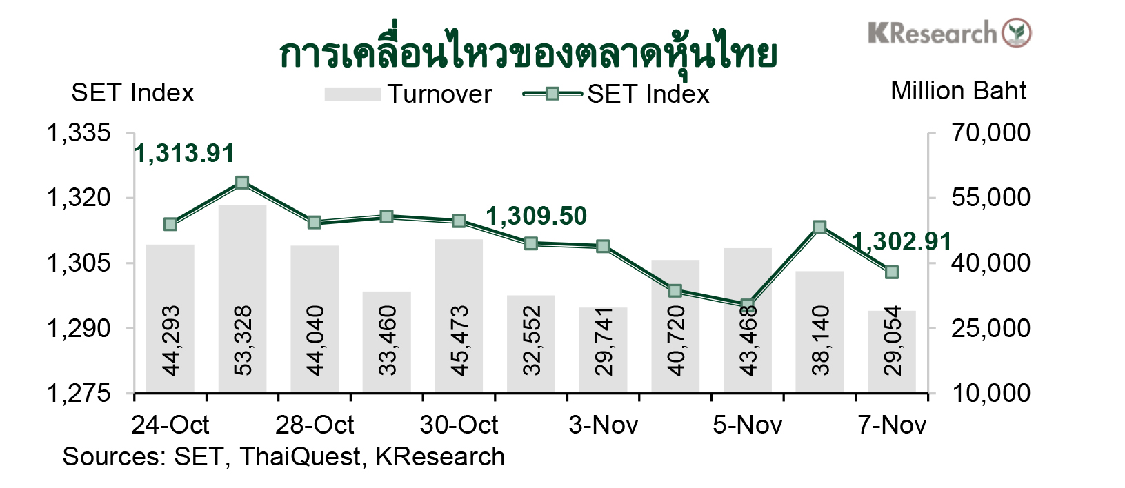 · ในวันศุกร์ที่ 7 พ.ย. 2568 ดัชนี SET ปิดที่ระดับ 1,302.91 จุด ลดลง 0.50% จากระดับปลายสัปดาห์ก่อน ขณะที่มูลค่าการซื้อขายเฉลี่ยต่อวันอยู่ที่ 36,224.60 ล้านบาท ลดลง 13.28% จากสัปดาห์ก่อน ส่วนดัชนี mai ลดลง 0.68% มาปิดที่ระดับ 225.15 จุด