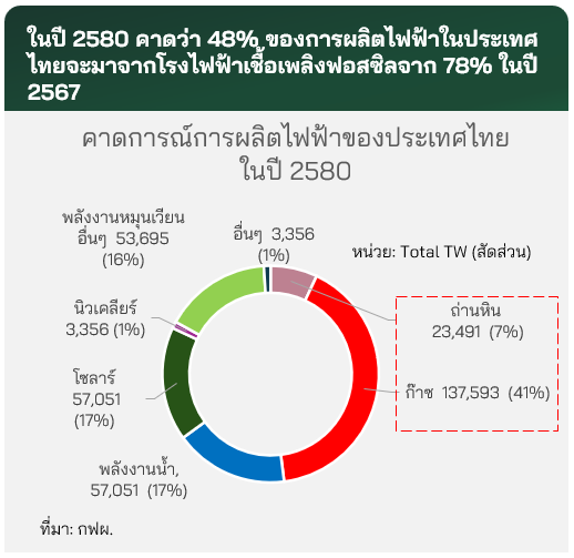 แผนพัฒนากำลังผลิตไฟฟ้าฉบับล่าสุดของประเทศไทย (PDP 2024) ระบุว่า ภายในปี 2580 การผลิตพลังงานไฟฟ้า 51% ของประเทศจะมาจากพลังงานหมุนเวียน และจะทยอยยุติการใช้ถ่านหินในการผลิตไฟฟ้าภายในปี 25934