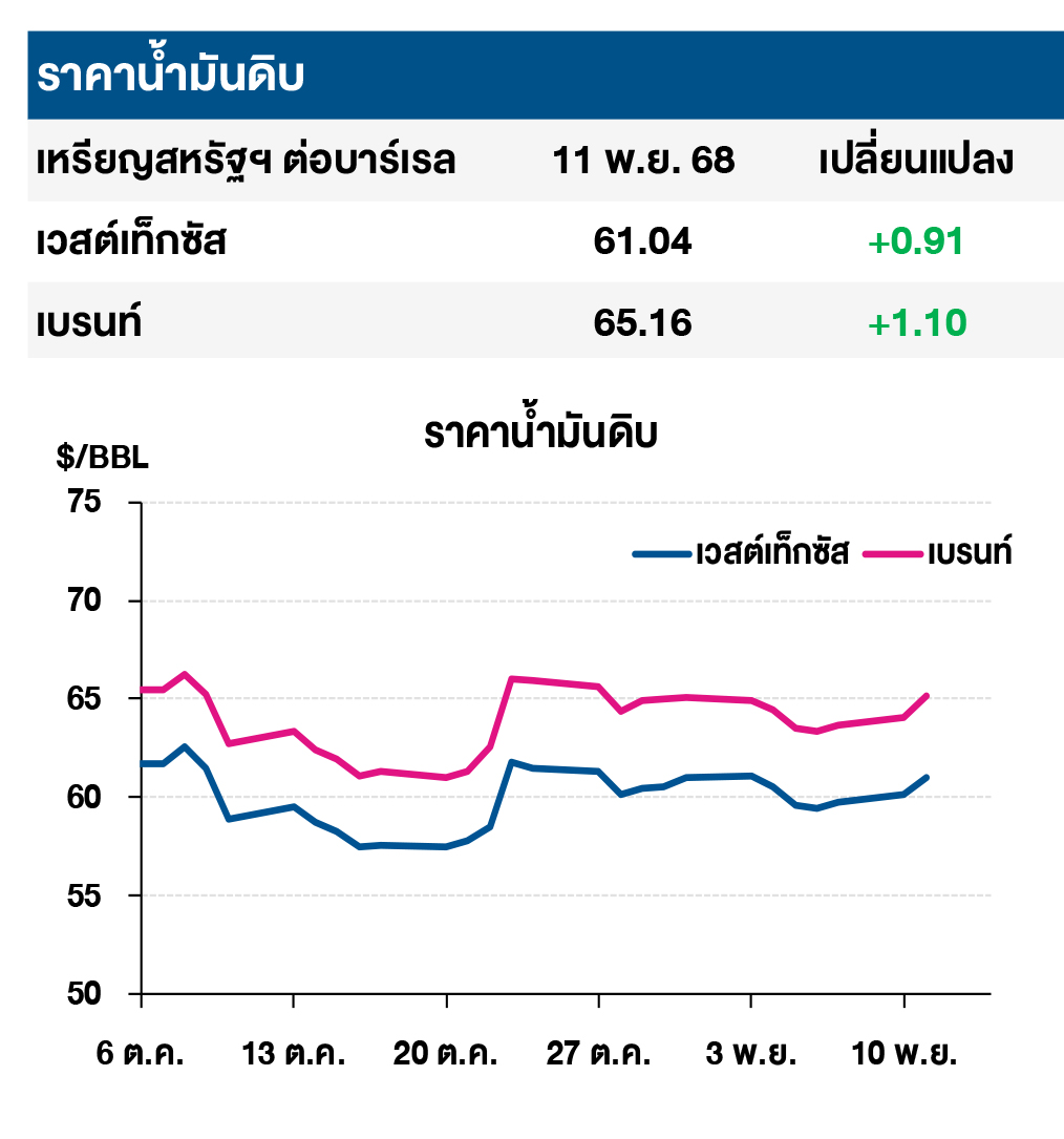 (+/-) ตลาดยังคงถูกกดดันจากอุปทาน หลังกลุ่มโอเปกและพันธมิตร (OPEC+) ได้ทำการตกลงเพิ่มกำลังการผลิตในเดือน ธ.ค. 68 ที่ 137,000 บาร์เรลต่อวัน โดยยังคงระงับการเพิ่มกำลังการผลิตในไตรมาสแรกของปีหน้าด้วย