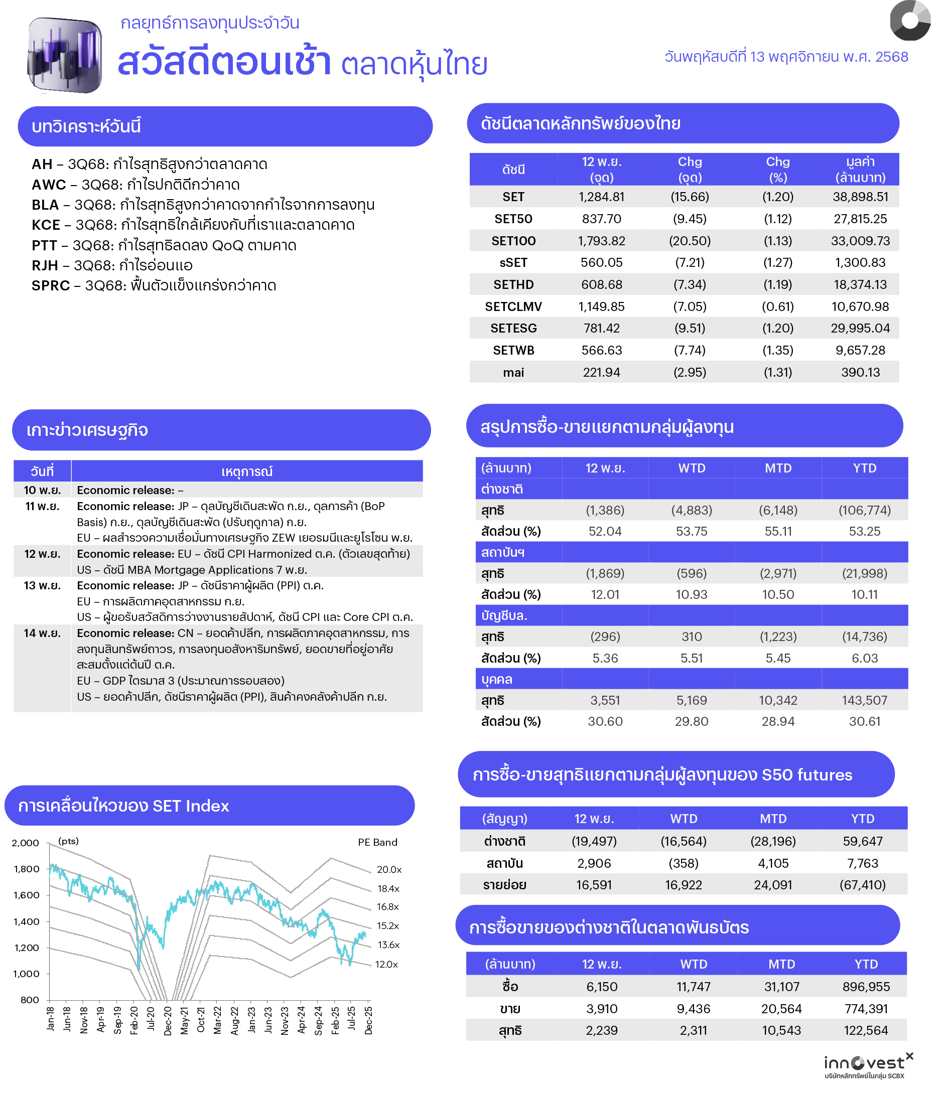 2. ตลาดหุ้นปิดภาคเช้า (13 พ.ย.68) บวก 3.14 จุด ดัชนี 1,287.95 จุด