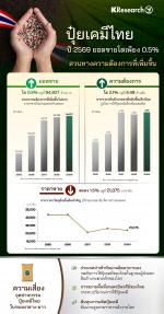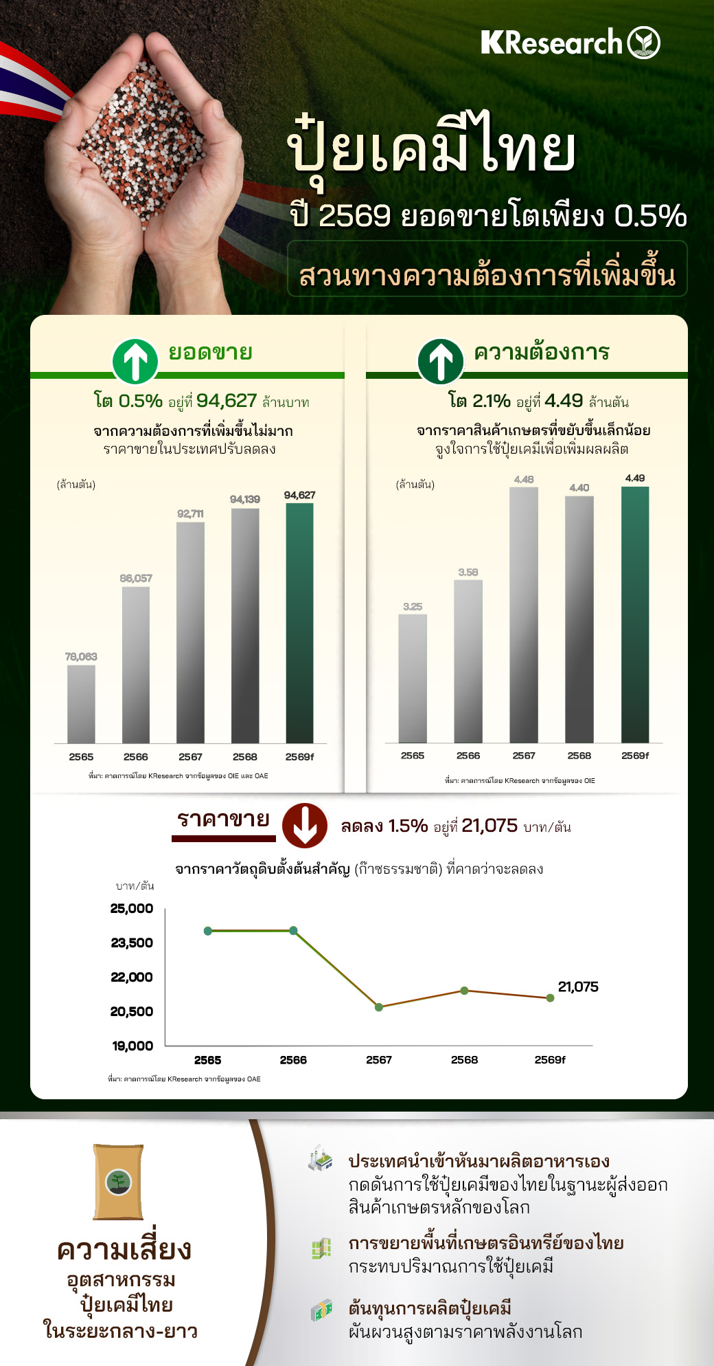 · ในปี 2569 ยอดขายปุ๋ยเคมีของไทย คาดว่าจะอยู่ที่ 94,627 ล้านบาท หรือโต 0.5% ชะลอลงจากปี 2568 ที่โต 1.5% ตามความต้องการใช้ปุ๋ยเคมีที่เพิ่มขึ้นไม่มาก และราคาขายปุ๋ยเคมีในประเทศที่ปรับลดลง ซึ่งเป็นไปตามแนวโน้มราคาปุ๋ยเคมีในตลาดโลก