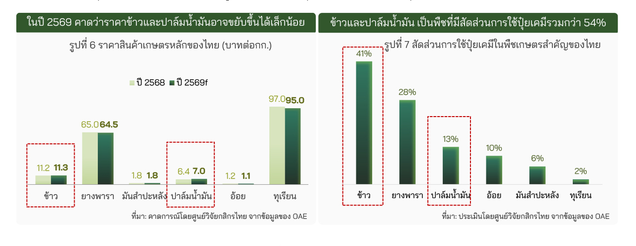 ทั้งนี้ ในปี 2569 คาดว่าราคาข้าวและปาล์มน้ำมันอาจปรับขึ้นได้เล็กน้อย (รูปที่ 6) ตามสภาพอากาศในช่วงครึ่งปีหลังที่อาจพลิกกลับมาเป็นปรากฏการณ์เอลนีโญ4 และเป็นไปตามราคาตลาดโลก5