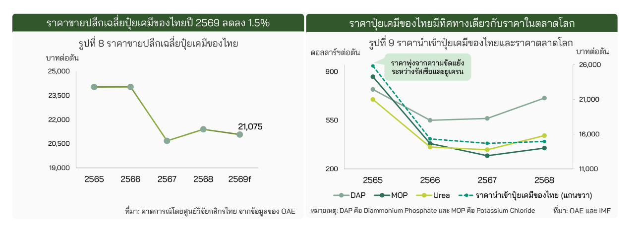 ในปี 2569 ราคาขายปุ๋ยเคมีในประเทศ คาดว่าจะปรับลดลง 1.5% (รูปที่ 8) เป็นไปตามราคาวัตถุดิบตั้งต้นสำคัญเพื่อผลิตปุ๋ยเคมีอย่างก๊าซธรรมชาติ ที่คาดว่าในปี 2569 ราคาก๊าซธรรมชาติในตลาดโลกจะลดลงราว 10.7%6 ทั้งนี้ ไทยนำเข้าปุ๋ยเคมีเป็นหลัก7 ทำให้ราคานำเข้าปุ๋ยเคมีของไทยจะเป็นไปในทิศทางเดียวกับราคาปุ๋ยเคมีในตลาดโลก (รูปที่ 9)