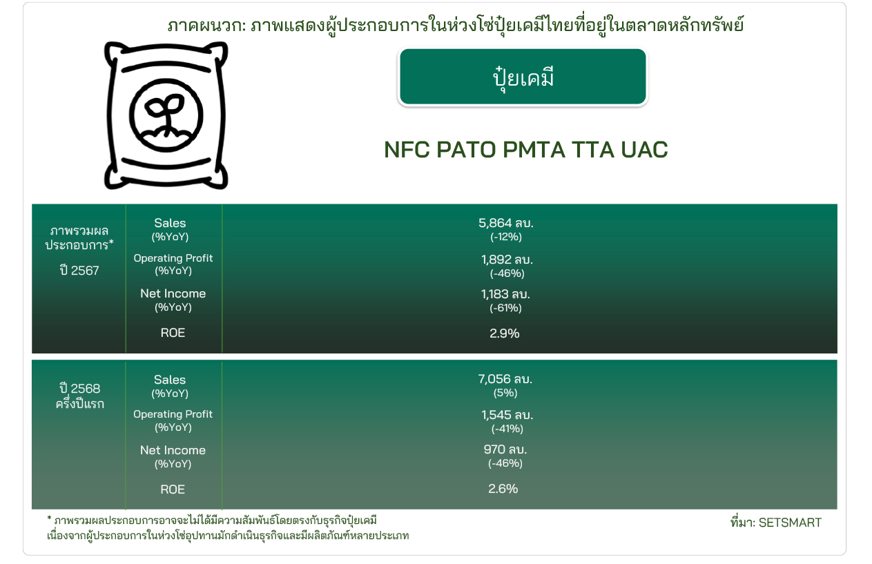 · ราคาขายปุ๋ยเคมีไทยในปี 2569 คาดว่าลดลง 1.5% จะช่วยหนุนความต้องการใช้ปุ๋ยเคมีไทยให้โต 2.1% ไปอยู่ที่ 4.49 ล้านตัน ตามราคาสินค้าเกษตรรายการหลักที่อาจขยับขึ้นเล็กน้อยอย่างข้าวและปาล์มน้ำมัน จึงจูงใจให้เกษตรกรมีความต้องการใช้ปุ๋ยเคมีเพิ่มขึ้น เพื่อเพิ่มผลผลิต