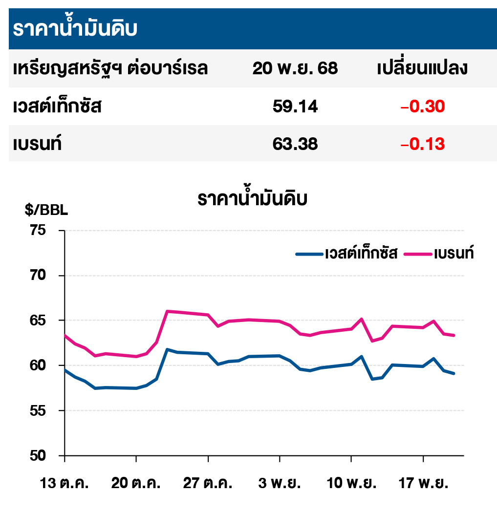 (-) ราคาน้ำมันดิบเวสต์เท็กซัสและเบรนท์ปรับลดลง หลังสหรัฐฯ ผลักดันข้อตกลงสันติภาพรัสเซีย–ยูเครน โดยล่าสุด ยูเครนได้รับร่างแผนสันติภาพจากสหรัฐฯ และประธานาธิบดีเซเลนสกีตกลงที่จะร่วมทำงานบนร่างแผนดังกล่าว พร้อมทั้งคาดว่าจะได้พูดคุยกับโดนัลด์ ทรัมป์ภายในไม่กี่วันข้างหน้า