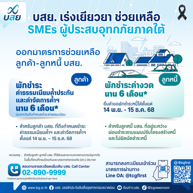 สำหรับผู้ประกอบการ SMEs ลูกค้า-ลูกหนี้ บสย. ที่อยู่ในพื้นที่ที่ได้รับผลกระทบจากสถานการณ์อุทกภัยในครั้งนี้ สามารถลงทะเบียนเข้าร่วมมาตรการฯ ผ่านช่องทาง LINE OA TCG First: @tcgfirst ภายในวันที่ 15 ธันวาคม 2568 หรือสอบถามข้อมูลเพิ่มเติมและรายละเอียดการเข้าร่วมมาตรการ ได้ที่สำนักงานเขตในพื้นที่ และ บสย. Call Center โทร. 02-890-9999