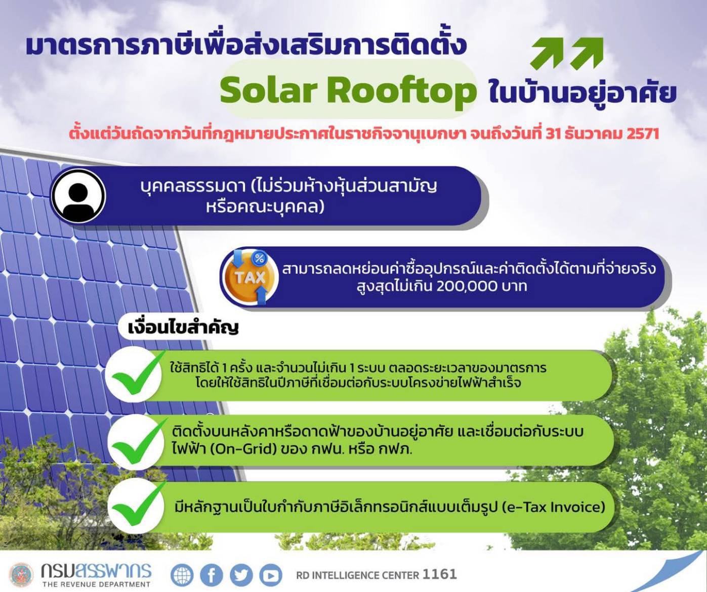 ดร.กุลยา ตันติเตมิท อธิบดีกรมสรรพากร เปิดเผยว่า “เพื่อให้เป็นไปตามนโยบายของรัฐบาลที่จะส่งเสริมการใช้พลังงานแสงอาทิตย์ในการผลิตไฟฟ้าภาคครัวเรือนและเพิ่มประสิทธิภาพการใช้พลังงานโดยเฉพาะในภาคอุตสาหกรรม อันจะช่วยประเทศไทยมีความยั่งยืนด้านพลังงานและสามารถบรรลุ