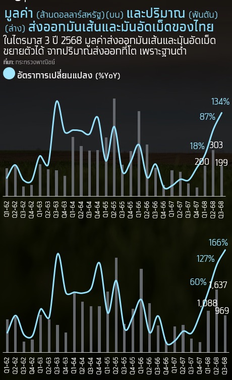 มูลค่าส่งออกผลิตภัณฑ์มันสำปะหลังทั้งหมดในไตรมาส 3 ปี 2568 อยู่ที่ 680 ล้านดอลลาร์สหรัฐ หดตัว -9%YoY โดยแบ่งเป็น 1. มูลค่าส่งออกมันเส้นและมันอัดเม็ดอยู่ที่ 199 ล้านดอลลาร์สหรัฐ (ราว 6,416 ล้านบาท) ขยายตัว 134%YoY ในแง่ปริมาณขยายตัวถึง 166%YoY เพราะฐานที่ต่ำในปีก่อน อีกทั้งคู่ค้าจีนกลับมานำเข้ามันเส้นและมันอัดเม็ดจากไทยอีกครั้งเนื่องจากราคาส่งออกมันเส้นและมันอัดเม็ดที่ถูกลงจึงสามารถแข่งขันในตลาดจีนได้มากขึ้น อีกทั้งอุปสงค์เพื่อการผลิตเอทานอลในจีนเริ่มฟื้นตัวบางส่วน สำหรับราคาส่งออกมันเส้นและมันอัดเม็ดหดตัว -12%YoY ตามทิศทางราคาข้าวโพดจีน (สินค้าทดแทน) ที่ปรับตัวลดลง 2. มูลค่าส่งออกแป้งมันสำปะหลังอยู่ที่ 467 ล้านดอลลาร์สหรัฐ (ราว 15,086 ล้านบาท) หดตัว -27%YoY โดยในแง่ปริมาณหดตัว -19%YoY เพราะปริมาณสต็อกแป้งมันสำปะหลังในจีนซึ่งเป็นคู่ค้าหลักของไทยยังอยู่ในระดับสูง ส่วนราคาส่งออกแป้งมันสำปะหลังหดตัว -10%YoY จากการแข่งขันกับราคาแป้งข้าวโพดจีนที่ถูกกว่า
