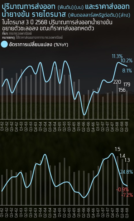 มูลค่าการส่งออกน้ำยางข้นไตรมาส 3 ปี 2568 ขยายตัว 0.3%YoY จากปริมาณการส่งออกที่ขยายตัว 8.1%YoY เนื่องจากการส่งออกไปจีนซึ่งคิดเป็นสัดส่วน 25% ของการส่งออกน้ำยางข้นทั้งหมดของไทยขยายตัวสูงถึง 52.8%YoY จากการที่จีนเร่งนำเข้าน้ำยางข้นเพื่อเป็นวัตถุดิบในการผลิตถุงมือยางส่งออกไปสหรัฐฯ แต่ราคาส่งออกน้ำยางข้นปรับตัวลดลง -7.2%YoY เนื่องจากความต้องการยางพาราที่ลดลงตามการชะลอตัวของเศรษฐกิจ ประกอบกับปริมาณผลผลิตยางพาราในไตรมาส 3 ปี 2568 เพิ่มขึ้นราว 2%YoY จากสภาพอากาศที่เอื้ออำนวย