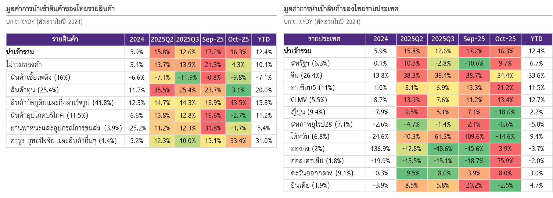 มูลค่านำเข้าสินค้าเดือน ต.ค. อยู่ที่ 32,272.5 ล้านดอลลาร์สหรัฐ ขยายตัว 16.3% ต่อเนื่องจาก 17.2% เดือนก่อน แต่สูงกว่าที่ประมาณการไว้มาก (SCB EIC ประเมิน 10.1%) ภาพรวมมูลค่านำเข้า 10 เดือนแรกปีนี้ขยายตัวสูง 12.4%