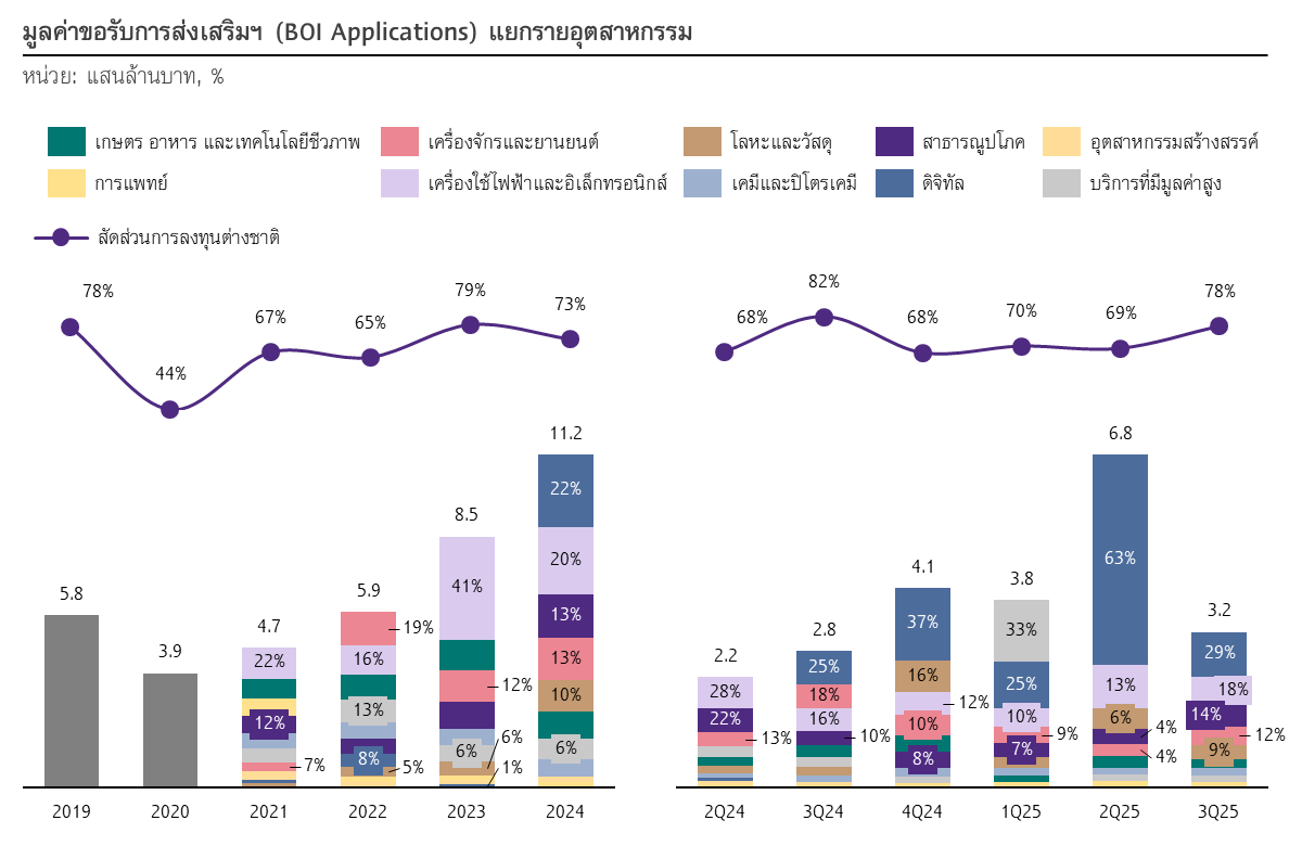 ในภาพรวม ไทยยังคงเป็นจุดหมายการลงทุนที่น่าดึงดูดในสายตานักลงทุนต่างชาติ แม้จะเผชิญความท้าทายจากความไม่แน่นอนของภาวะการค้าโลก สะท้อนจากมูลค่าการขอรับการส่งเสริมการลงทุนจากต่างประเทศในไตรมาสที่ 2 ปี 2025 (หลังสหรัฐฯ ประกาศนโยบายภาษี) ที่ยังเพิ่มขึ้นจากไตรมาสก่อนหน้าจาก 2.67 แสนล้านบาท มาอยู่ที่ 4.70 แสนล้านบาท และเริ่มชะลอตัวในไตรมาสที่ 3 (สหรัฐฯ เริ่มใช้นโยบายภาษี) มาอยู่ที่ 2.47 แสนล้านบาทจากการลดลงของมูลค่าการลงทุนในอุตสาหกรรมดิจิทัลหลังขยายตัวสูงในช่วงก่อนหน้า อย่างไรก็ดี