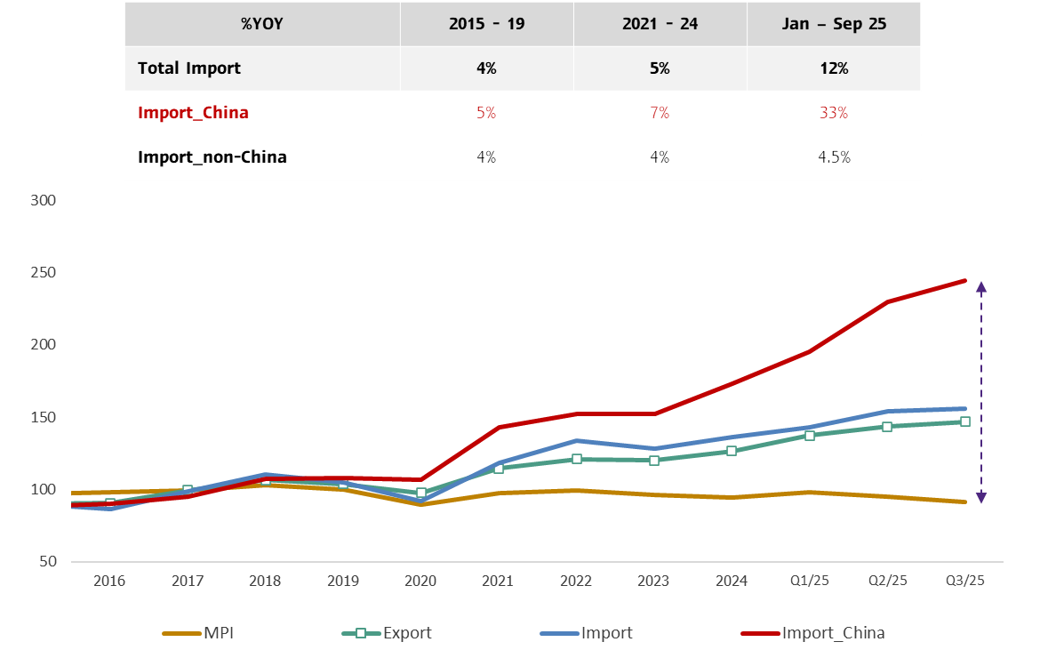 แม้นักลงทุนต่างชาติจะสนใจเข้ามาลงทุนในไทยต่อเนื่อง แต่ไทยยังเผชิญความท้าทายสำคัญในหลายด้าน โดยเฉพาะการสร้างมูลค่าเพิ่มภายในประเทศ ที่อาจจำกัดศักยภาพในการสร้างประโยชน์ทางเศรษฐกิจในระยะยาว ซึ่งปัจจุบันการสร้างมูลค่าเพิ่มภายในประเทศยังอยู่ในระดับต่ำและไทยพึ่งพาการนำเข้ามากขึ้นอย่างเห็นได้ชัด โดยในปี 2025 มูลค่าการนำเข้าจากจีนขยายตัวสูงถึง 133% เมื่อเทียบกับค่าเฉลี่ยช่วงปี 2015–2019 ขณะที่ดัชนีผลผลิตอุตสาหกรรม (MPI) ยังทรงตัวใกล้ระดับเฉลี่ยในอดีต (รูปที่ 5) โดยเฉพาะกลุ่มอิเล็กทรอนิกส์ คอมพิวเตอร์ และฮาร์ดดิสก์ไดรฟ์ ที่ยังคงพึ่งพาวัตถุดิบนำเข้าในสัดส่วนสูง สะท้อนถึงการลงทุนจากต่างประเทศจำนวนมากยังเชื่อมโยงกับผู้ผลิตในประเทศได้ไม่มากนักส่งผลให้การสร้างมูลค่าเพิ่มให้กับผู้ผลิตในประเทศและการต่อยอดสู่การพัฒนาการผลิตโดยใช้เทคโนโลยีขั้นสูงยังมีข้อจำกัด