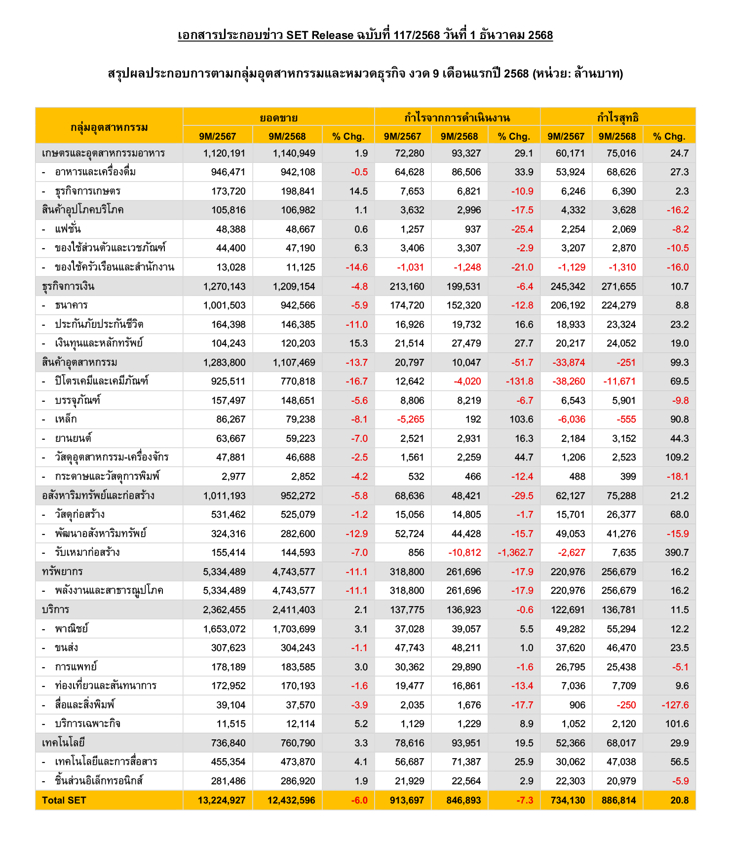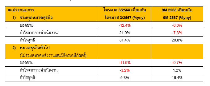 • ในไตรมาส 3/2568 บจ. เกือบทุกหมวดธุรกิจมียอดขาย และกำไรจากการดำเนินงานลดลง