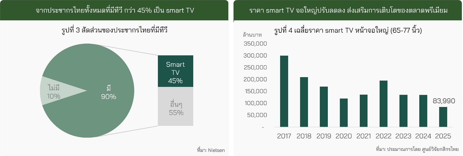 จากพฤติกรรมผู้บริโภคที่หันมาใช้ทีวีสำหรับการดูสตรีมมิ่ง ทำให้ทีวีพรีเมียมเป็นที่ต้องการมากขึ้น โดยเฉพาะ smart TV หน้าจอใหญ่ ซึ่งปัจจุบัน smart TV หน้าจอใหญ่ครองสัดส่วนตลาดทีวีไทยอยู่ราว 35% ของยอดขายทีวีทั้งหมด