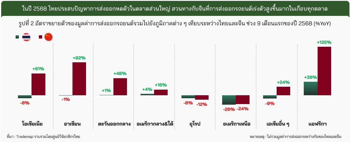 โดยในช่วง 9 เดือนแรกของปี 2568 พบไทยมีการส่งออกลดลงในหลายตลาดหลัก โดยเฉพาะโอเชียเนีย และอาเซียน (ตลาดหลักที่มีส่วนแบ่งในตลาดส่งออกรถยนต์ของไทยรวมกันถึงกว่า 56%) ตรงข้ามกับจีนที่แม้จะส่งออกลดลงในยุโรปและอเมริกาเหนือ จากการถูกตั้งกำแพงภาษีสูงกว่าประเทศอื่นที่ 35.3% และ 110% ตามลำดับ แต่จีนก็ยังส่งออกไปตลาดอื่น ๆ ได้ดี (รูปที่ 2)