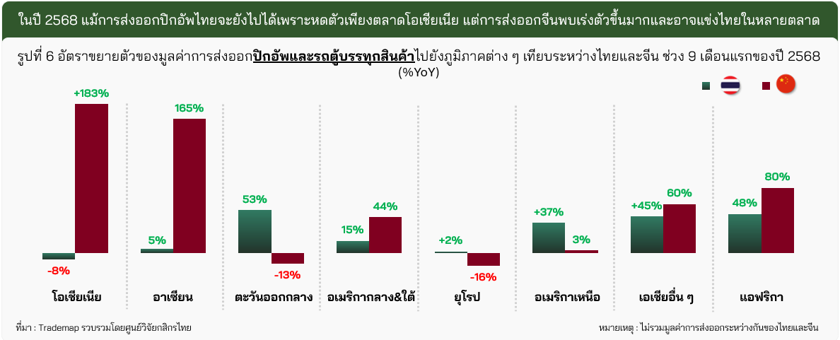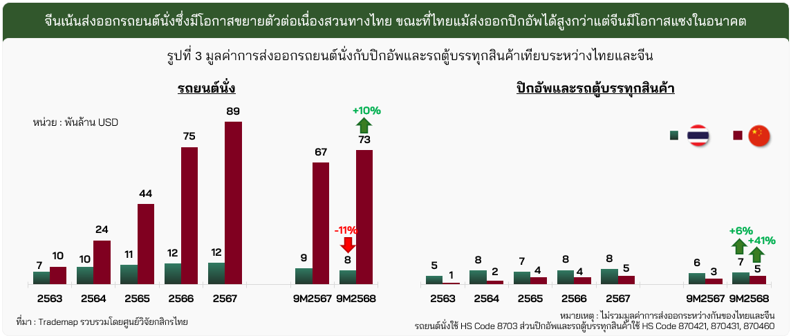 · การส่งออกรถยนต์ไทยกำลังถูกจีนเข้าแย่งตลาดมากขึ้นเรื่อย ๆ โดยในกลุ่มรถยนต์นั่งพบการแข่งขันที่เพิ่มขึ้นชัดเจนจากกลุ่ม xEV จากจีน ส่วนกลุ่มปิกอัพแม้ยังส่งออกได้ดี แต่ตลาดหลักอย่างออสเตรเลียเริ่มมีปัญหา โดยจีนได้ขยับขึ้นเป็นหนึ่งคู่แข่งสำคัญ ซึ่งลักษณะเดียวกันนี้เกิดขึ้นกับในอีกหลายตลาด