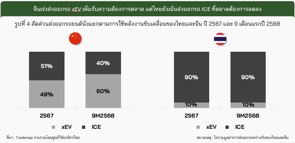 ปัจจุบันการส่งออกรถยนต์นั่งของไทยกำลังเผชิญกับความท้าทายสำคัญ โดยนอกจากสงครามราคาแล้ว ยังมีเรื่องปัญหาความต้องการใช้รถที่เปลี่ยนไปของผู้บริโภค เนื่องจากไทยยังเน้นส่งออกรถยนต์นั่งเครื่องยนต์สันดาปภายใน (ICE) ที่ตลาดกำลังต้องการลดลงถึง 90% ส่วนรถยนต์นั่งกลุ่ม xEV ที่ตลาดกำลังต้องการมากขึ้น กลับมีส่วนแบ่งในการส่งออกเพียง 10% ซึ่งสวนทางกับจีนที่เพิ่มสัดส่วนส่งออกรถยนต์นั่งกลุ่ม xEV ขึ้นอย่างรวดเร็วสู่ 60% จากปีก่อนที่สัดส่วนส่งออกอยู่ที่ 49% (รูปที่ 4)