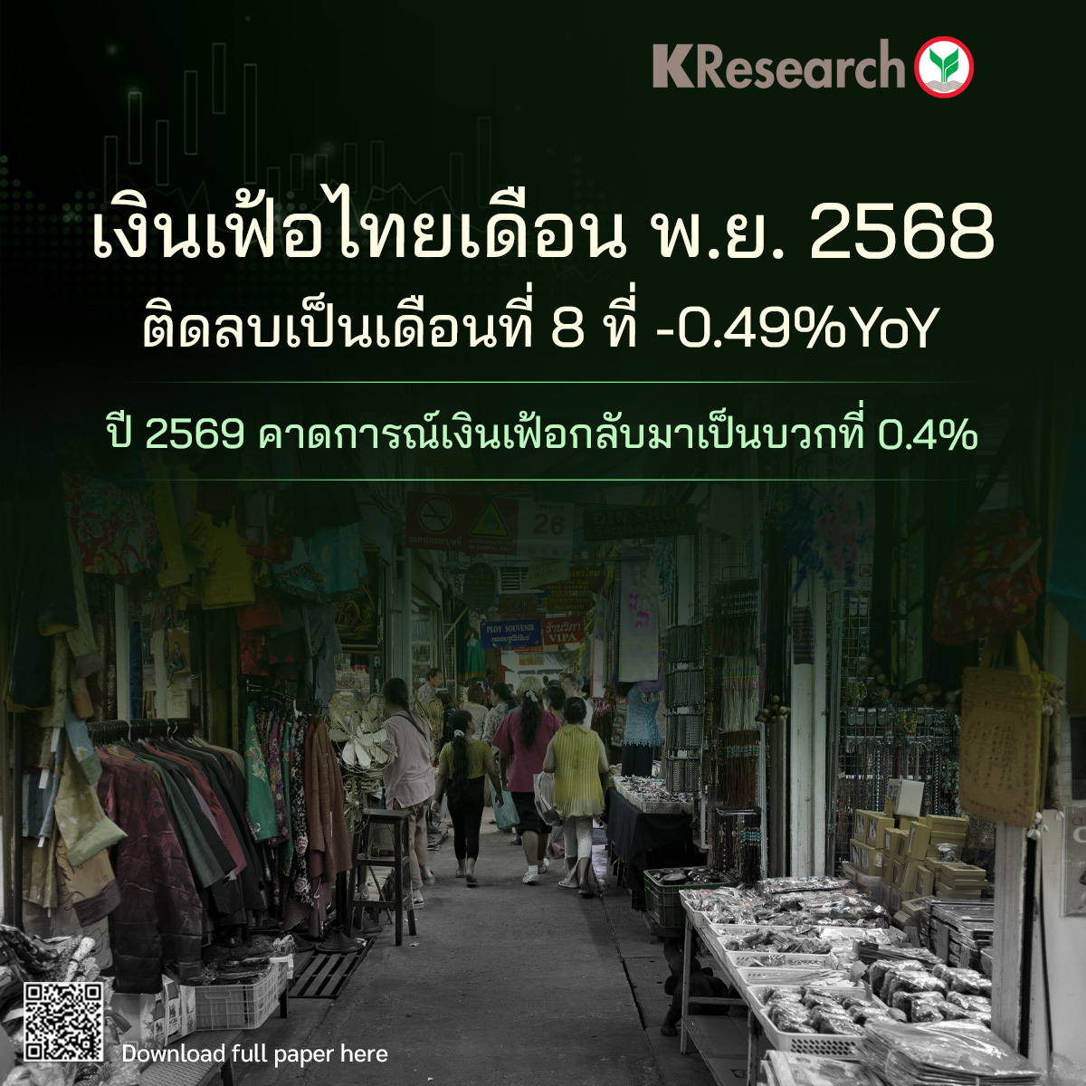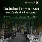 ศูนย์วิจัยกสิกรไทยวิเคราะห์ "เงินเฟ้อไทยเดือนพ.ย. 2568 ติดลบเป็นเดือนที่ 8 ที่ -0.49%YoY ปี 2569 คาดการณ์เงินเฟ้อกลับมาเป็นบวกที่ 0.4%"