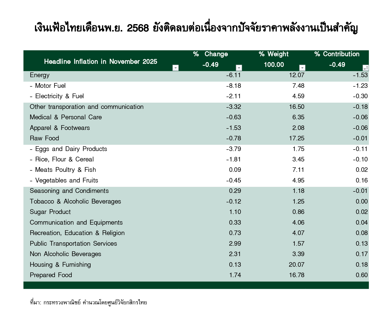 อัตราเงินเฟ้อทั่วไปของไทยเดือนพ.ย. 2568 อยู่ที่ -0.49%YoY ยังคงติดลบต่อเนื่องเป็นเดือนที่ 8 โดยฝั่งอุปทานยังเป็นปัจจัยกดดันหลัก ขณะที่ฝั่งอุปสงค์เข้ามาช่วยหนุนเล็กน้อย โดยมีรายละเอียด ดังนี้