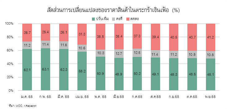 ศูนย์วิจัยกสิกรไทยยังคงประมาณการอัตราเงินเฟ้ออยู่ที่ -0.1% ในปี 2568 โดยในช่วง 11 เดือนแรกเงินเฟ้อติดลบอยู่ที่ -0.12%YoY และแนวโน้มเดือนสุดท้ายของปีคาดว่าจะยังติดลบต่อเนื่องแต่ในอัตราที่ลดลง ส่วนหนึ่งจากฐานราคาผักและผลไม้ที่อยู่ในระดับต่ำ ทั้งนี้ ยังมีความเสี่ยงต่อภาวะเงินฝืด สะท้อนจากสัดส่วนรายการสินค้าที่ราคาปรับลดลงในตระกร้าเงินเฟ้อขยายวงกว้างมากขึ้นที่ 41.2% จากเดือนก่อนหน้าที่ 40.7% ของรายการทั้งหมดของสินค้าในตระกร้าเงินเฟ้อ (รูปที่ 2)