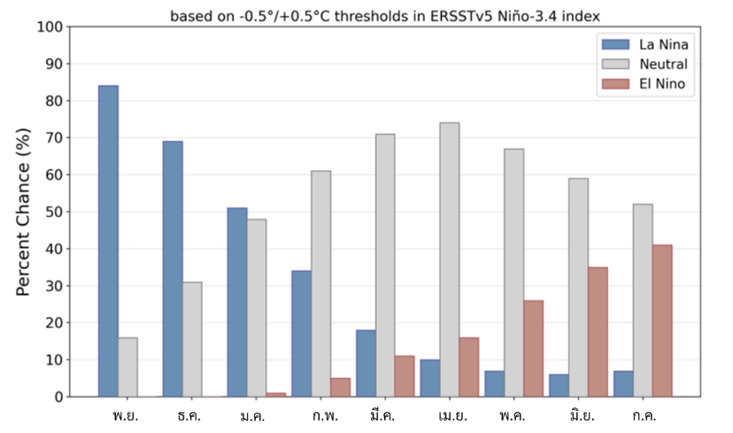 รูปที่ 3 NOAA คาดความน่าจะเป็นในการเปลี่ยนจากปรากฎการณ์ลานีญาเข้าสู่ภาวะปกติในปี 2569