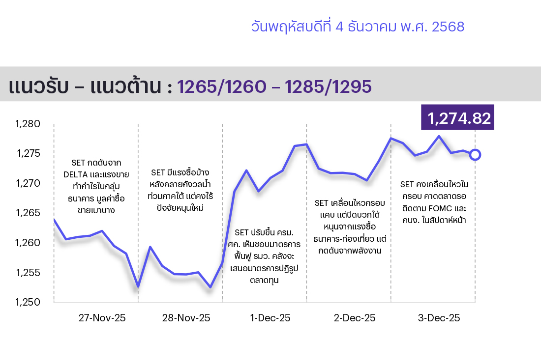 คาดตลาดแกว่งไซด์เวย์/แกว่งก่อนหยุดยาว ตลาดยังชะลอที่แนวต้าน 1275-1278 ไม่สามารถยืนเหนือได้ ติดตามมาตรการส่งเสริมการออม (ISA) จะมีรายละเอียดที่น่าสนใจมากพอและดึงดูดเม็ดเงินไหลเข้าตลาดเพียงใด ปัจจัยต่างประเทศการจ้างงานเอกชนสหรัฐฯ ADP ต่ำกว่าคาดหนุนให้เฟดลดดอกเบี้ยง่ายขึ้น แม้ ISM Services ออกมาดี ทางเทคนิค ตลาดยังไม่ยืนเหนือ 1275-1278 ต้องยืนเหนือได้จึงจะแกว่งตัวขึ้นรอบใหม่ ยืนไม่ได้ยังไซด์เวย์ แนวรับ 1265/1260 แนวต้าน 1285/1295