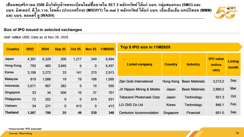 • เดือนพฤศจิกายน 2568 มีบริษัทเข้าจดทะเบียนใหม่ซื้อขายใน SET 2 หลักทรัพย์ ได้แก่ บมจ. กลุ่มสมอทอง  (SMO) และ บมจ. มิสเตอร์. ดี.ไอ.วาย. โฮลดิ้ง (ประเทศไทย) (MRDIYT) ใน mai 2 หลักทรัพย์ ได้แก่ บมจ. เอ็มเอ็มเอ็ม แคปปิตอล (MMM) และ บมจ. ลอนดรี้ ยู (WASH)