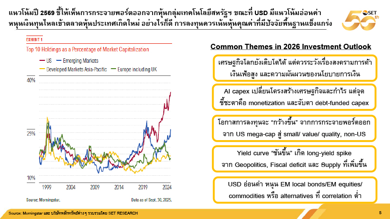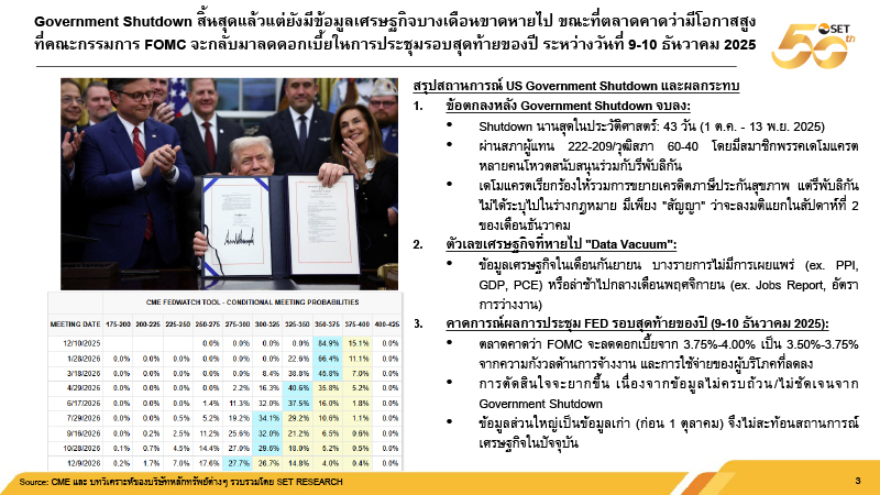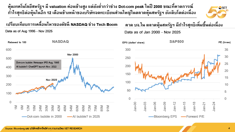 แม้ว่า Government Shutdown ของสหรัฐฯ สิ้นสุดแล้วแต่ยังมีข้อมูลเศรษฐกิจบางเดือนขาดหายไป ขณะที่ตลาดคาดว่ามีโอกาสสูงที่คณะกรรมการนโยบายการเงินของธนาคารกลางสหรัฐ (Federal Open Market Committee : FOMC) จะกลับมาลดดอกเบี้ยในการประชุมรอบสุดท้ายของปี ระหว่างวันที่ 9-10 ธันวาคม 2568 โดยคณะกรรมการฯ ที่ไม่สนับสนุนให้ธนาคารกลางสหรัฐฯ (Fed) ลดดอกเบี้ย สาเหตุหนึ่งมาจากความกังวลเกี่ยวกับหุ้นเทคโนโลยีสหรัฐฯ ที่มี valuation ค่อนข้างสูง อย่างไรก็ดี หากพิจารณาระดับการเคลื่อนไหวของดัชนี NASDAQ ในช่วงที่ผ่านมานี้ยังต่ำกว่าช่วง Dot-com peak ในปี 2543 ขณะที่คาดการณ์กำไรสุทธิต่อหุ้นในอีก 12 เดือนข้างหน้าของบริษัทจดทะเบียนส่วนใหญ่ในตลาดหุ้นสหรัฐฯ ยังเติบโตต่อเนื่อง ทั้งนี้ นักวิเคราะห์หลายสำนักแนะนำให้การกระจายพอร์ตออกจากหุ้นกลุ่มเทคโนโลยีสหรัฐฯ ไปยังตลาดหุ้นประเทศอื่นๆ รวมถึงตลาดหุ้นในกลุ่มประเทศตลาดเกิดใหม่ (Emerging market)