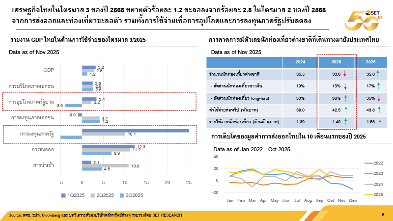 นายศรพล ตุลยะเสถียร รองผู้จัดการ หัวหน้าสายงานวางแผนกลยุทธ์องค์กร ตลาดหลักทรัพย์แห่งประเทศไทย เปิดเผยว่า เศรษฐกิจไทยในไตรมาสสามของปี 2568 ขยายตัวร้อยละ 1.2 ชะลอลงจากร้อยละ 2.8 ในไตรมาสสอง จากการส่งออกและท่องเที่ยวชะลอตัว รวมทั้งการใช้จ่ายเพื่อการอุปโภคและการลงทุนภาครัฐปรับลดลง รวมทั้งค่าเงินบาทที่แข็งค่า ส่งผลกระทบต่อยอดขายของบริษัทจดทะเบียนในเกือบทุกหมวดธุรกิจอย่างชัดเจน นอกจากนี้ สถานการณ์อุทกภัยภาคใต้ที่เกิดขึ้นนอกเหนือความคาดหมายส่งกระทบเพิ่มเติมต่อภาวะการลงทุน อย่างไรก็ดี ยังเห็นเงินทุนไหลเข้าในกองทุนรวมไทยเพื่อความยั่งยืน (ThaiESG) เพื่อรับสิทธิประโยชน์ทางภาษีอย่างต่อเนื่อง โดยที่ผ่านมาการขายสุทธิของกองทุนรวมหุ้นระยะยาว (LTF) จะลดลงในช่วงสองเดือนสุดท้ายของปี