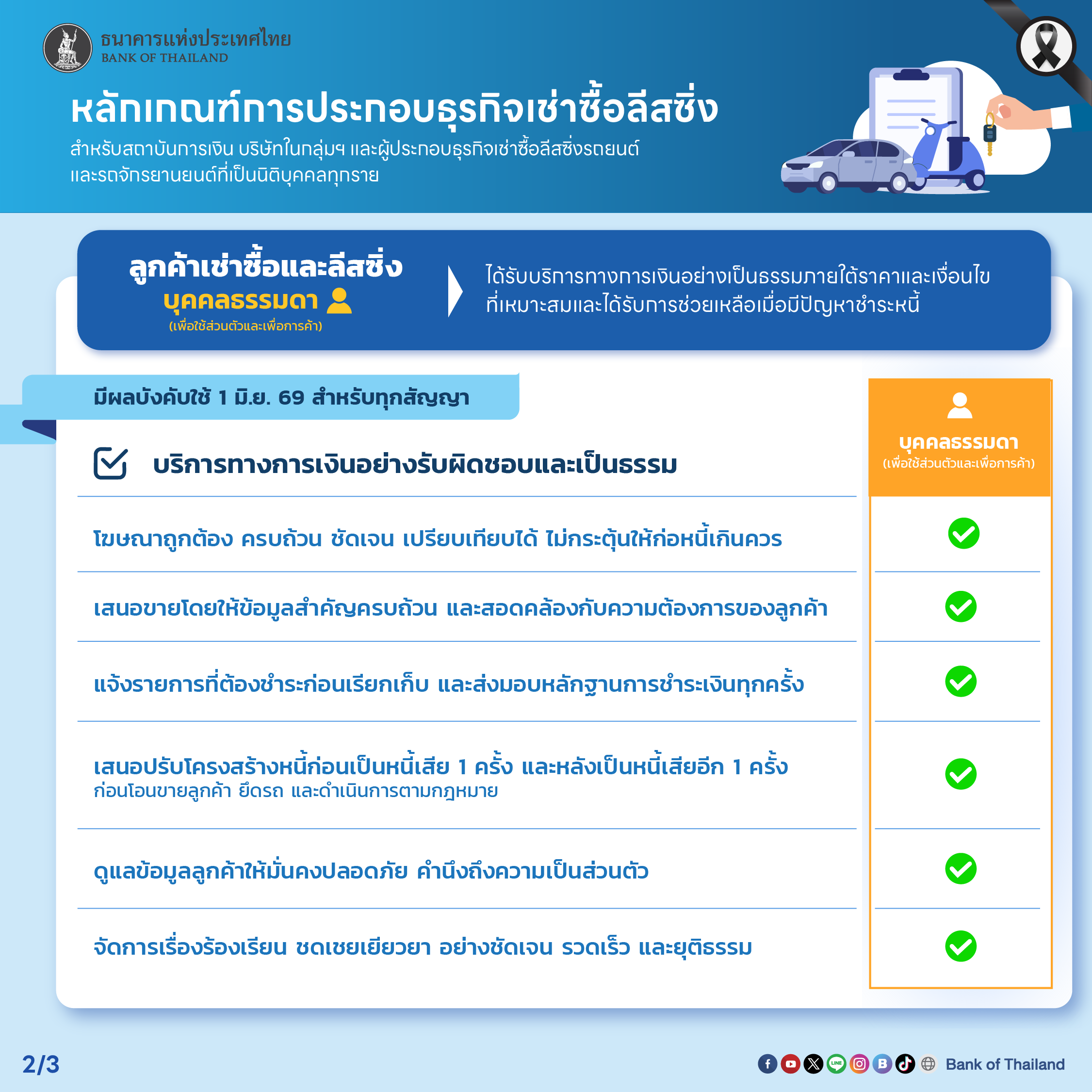 นางสาวดารณี แซ่จู ผู้ช่วยผู้ว่าการ สายกำกับระบบการชำระเงินและคุ้มครองผู้ใช้บริการทางการเงิน ธนาคารแห่งประเทศไทย (ธปท.) เปิดเผยว่า ธปท. ได้ออกประกาศ เรื่อง การกำหนดหลักเกณฑ์ วิธีการ และเงื่อนไขในการประกอบธุรกิจการให้เช่าซื้อและการให้เช่าแบบลีสซิ่งรถยนต์และรถจักรยานยนต์ ซึ่งลงราชกิจจานุเบกษาเมื่อวันที่ 3 ธันวาคม 2568 โดยประกาศฯ ดังกล่าวมีวัตถุประสงค์เพื่อจะยกระดับการให้บริการทางการเงินของผู้ประกอบธุรกิจฯ ภายใต้การกำกับของ ธปท. ให้มีความรับผิดชอบ เป็นธรรม และโปร่งใส เพื่อให้ลูกค้าได้รับบริการที่เป็นมาตรฐานและได้รับข้อมูลเกี่ยวกับผลิตภัณฑ์อย่างครบถ้วน ภายใต้ราคาและเงื่อนไขที่เหมาะสม รวมถึงได้รับการดูแลช่วยเหลือเมื่อมีปัญหาในการชำระหนี้