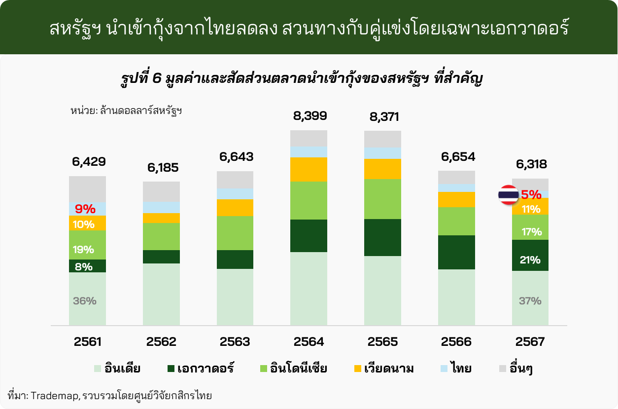 2) Reciprocal Tariffs จะยิ่งกระทบความสามารถในการแข่งขันของไทยมากขึ้น ก่อนมาตรการภาษีทรัมป์ 2.0 ไทยสูญเสียส่วนแบ่งในตลาดสหรัฐฯ จากไม่สามารถแข่งขันด้านราคาได้มาเป็นทุนเดิมอยู่แล้ว ประกอบกับการถูกตัดสิทธิ์ GSP ตั้งแต่ปี 2563 ทำให้บางสินค้ากุ้งแปรรูปของไทยต้องเสียภาษีนำเข้าในอัตราปกติ (MFN) สูงสุดถึง 5% ส่งผลให้สัดส่วนมูลค่าการนำเข้ากุ้งจากไทยในตลาดสหรัฐฯ ลดลงต่อเนื่องจาก 9% ในปี 2561 เหลือเพียง 5% ในปี 2567 (รูปที่ 6)