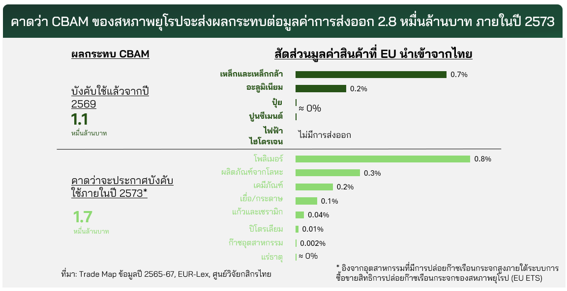 ตั้งแต่วันที่ 1 มกราคม 2569 สหภาพยุโรปจะเริ่มจัดเก็บภาษีนำเข้าภายใต้มาตรการปรับราคาคาร์บอนข้ามพรมแดน (CBAM) ตามปริมาณการปล่อยก๊าซเรือนกระจกของสินค้า ทั้งทางตรงและทางอ้อมจากกระบวนการผลิตของสินค้า1 โดยในระยะแรก ศูนย์วิจัยกสิกรไทยคาดว่า CBAM จะส่งผลกระทบต่อ 3.8% ของสินค้าส่งออกของไทยไปสหภาพยุโรปในปี 2569 คิดเป็นมูลค่าประมาณ 28,000 ล้านบาท