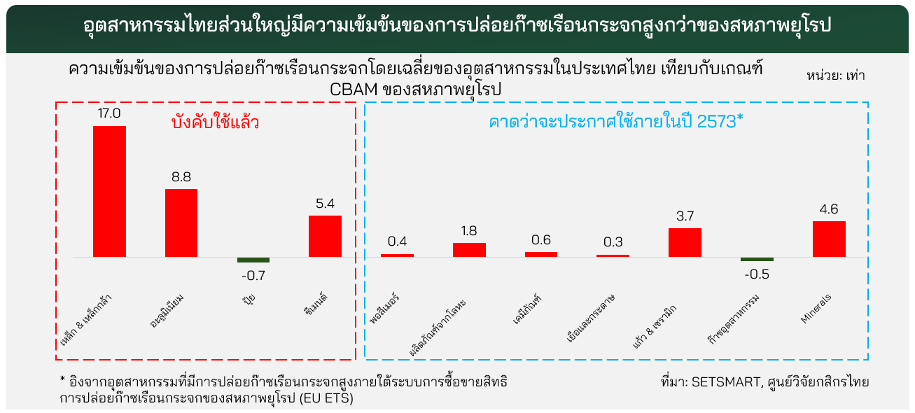อุตสาหกรรมที่เปราะบางที่สุดคือ เหล็กและเหล็กกล้า โดยในปี 2567 มูลค่าการส่งออกของไทยไปยังสหภาพยุโรปอยู่ที่ 95.1 ล้านดอลลาร์สหรัฐ (หรือคิดเป็น 5.7% ของมูลค่าส่งออกเหล็กทั้งหมดของไทย3) อุตสาหกรรมเหล็กมีการปล่อยคาร์บอนในระดับที่สูงมาก เนื่องจากต้องใช้เตาถลุงถ่านหินในการผลิต การใช้ใบรับรอง CBAM จะทำให้ต้นทุนเหล็กไทยเพิ่มขึ้นประมาณ 1,300–1,500 บาทต่อตัน หรือคิดเป็น 1.5–1.7% ของมูลค่าสินค้า4 ซึ่งจะส่งผลให้ภาระต้นทุนรวมต่อปีจากการซื้อใบรับรอง CBAM อยู่ที่ราว 167–193 ล้านบาท