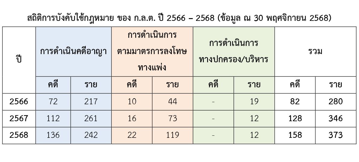 ทั้งนี้ ตั้งแต่ปี 2566 – 2568 การดำเนินการบังคับใช้กฎหมายผ่านทั้ง 3 ช่องทางหลักของ ก.ล.ต. มีจำนวนคดีที่แล้วเสร็จเพิ่มขึ้นต่อเนื่อง โดยในปี 2566 มีจำนวน 82 คดี ผู้กระทำผิด 280 ราย ปี 2567 มีจำนวน 128 คดี ผู้กระทำผิด 346 ราย และในปี 2568 (ข้อมูล ณ วันที่ 30 พฤศจิกายน 2568) มีจำนวน 158 คดี ผู้กระทำผิดรวม 373 ราย