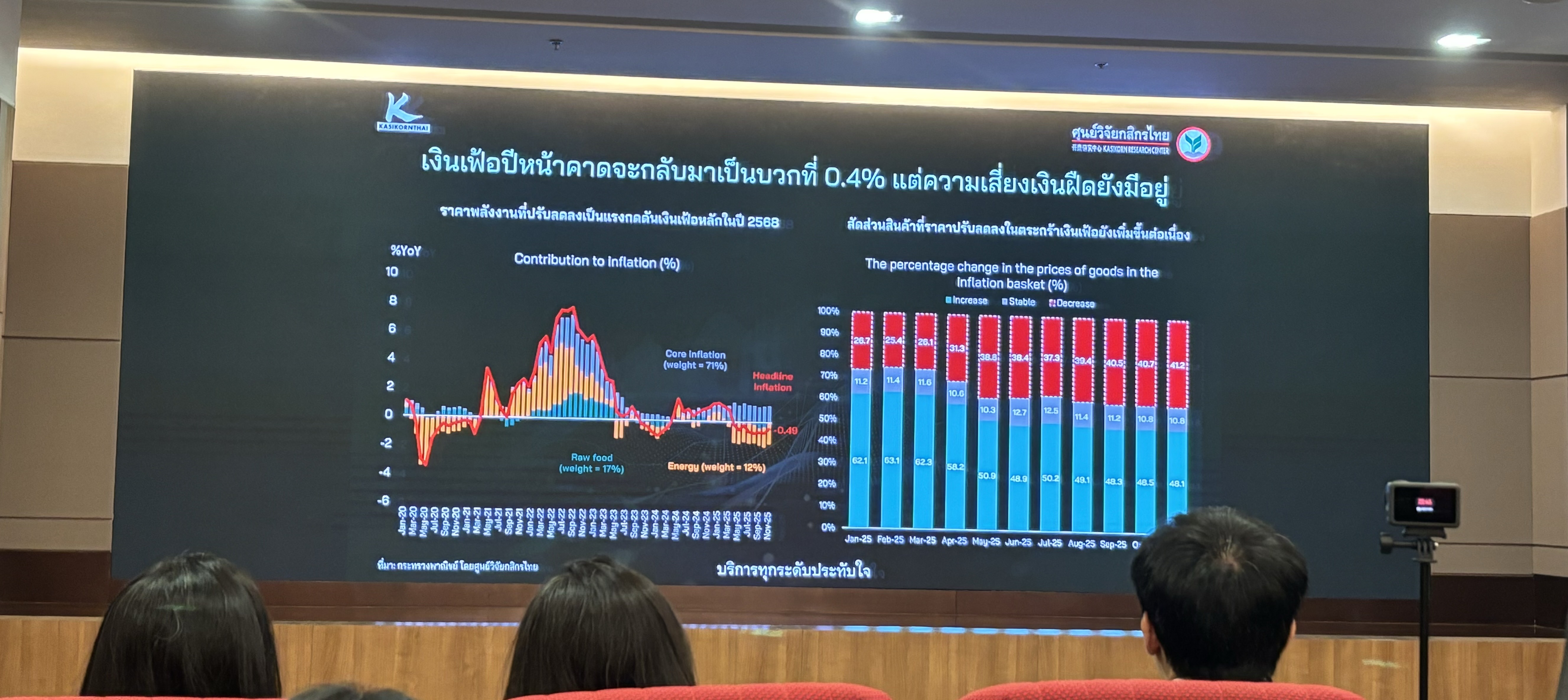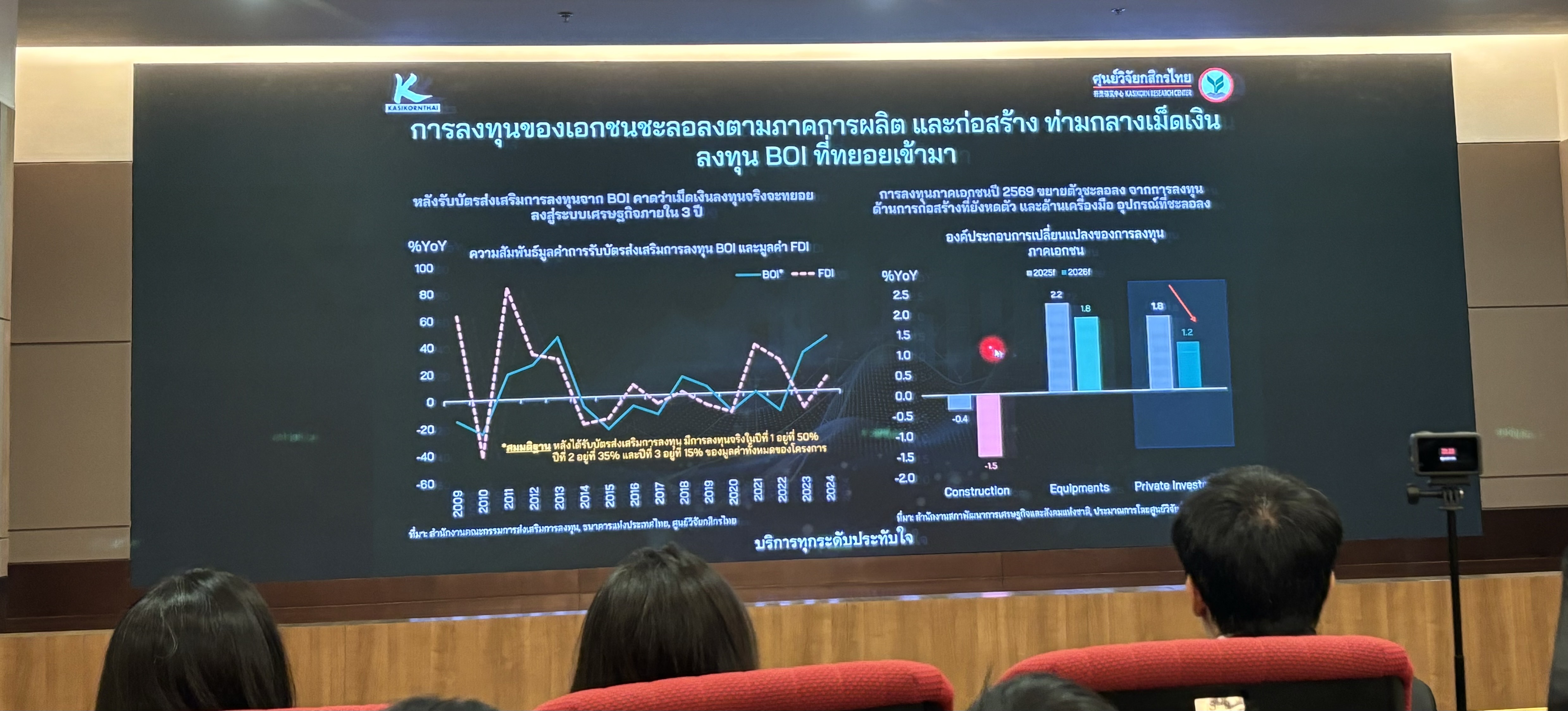 นางสาวณัฐพร ตรีรัตน์ศิริกุล รองกรรมการผู้จัดการ บริษัท ศูนย์วิจัยกสิกรไทย จำกัด ระบุว่า เศรษฐกิจไทยมีแนวโน้มชะลอลงในปี 2569 โดยศูนย์วิจัยกสิกรไทยคาดการณ์อัตราการเติบโตของเศรษฐกิจไทยปี 2569 ที่ 1.6% เทียบกับปี 2568 ที่คาดว่าจะขยายตัวที่ 2.0% โดยส่งออกสินค้าของไทยในปี 2569 คาดว่าจะหดตัวส่งผลทำให้แรงขับเคลื่อนที่สำคัญของเศรษฐกิจไทยลดลง การท่องเที่ยวที่จะยังฟื้นตัวกลับมาได้ไม่เต็มที่ ในขณะที่การบริโภคของครัวเรือนที่ยังเป็นแรงขับเคลื่อนหลักของเศรษฐกิจมีแนวโน้มชะลอลง ส่วนหนึ่งจากแรงหนุนจากการใช้จ่ายและมาตรการกระตุ้นเศรษฐกิจของภาครัฐอาจลดลงตามข้อจำกัดทางการคลัง โดยคาด กนง. ลดดอกเบี้ยนโยบายต่ออีก 1 ครั้ง ในปี 2569 นอกจากนี้ ยังต้องติดตามความไม่แน่นอนทางการเมือง โดยเฉพาะหลังการเลือกตั้งด้วยเช่นกัน