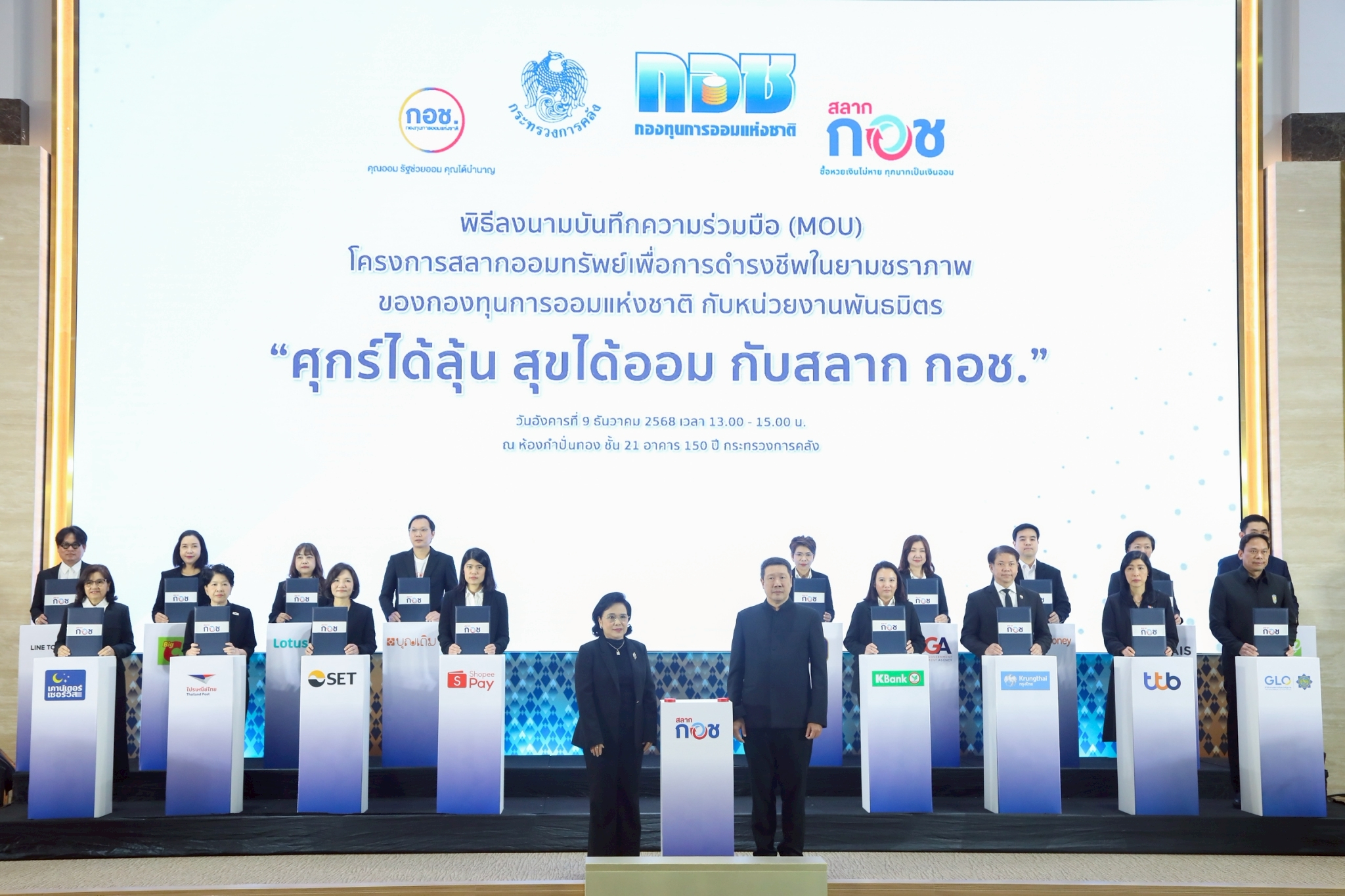 นายธีรลักษ์ แสงสนิท รองปลัดกระทรวงการคลัง ประธานกรรมการกองทุนการออมแห่งชาติ (กอช.) เป็นประธานพิธีลงนามบันทึกความร่วมมือ (MOU) โครงการสลากออมทรัพย์เพื่อการดำรงชีพในยามชราภาพของกองทุนการออมแห่งชาติ กับหน่วยงานพันธมิตร “ศุกร์ได้ลุ้น สุขได้ออม กับสลาก กอช.” โดยมีนางสาวจารุลักษณ์ เรืองสุวรรณ เลขาธิการคณะกรรมการกองทุนการออมแห่งชาติ กล่าวรายงาน ณ ห้องกำปั่นทอง ชั้น 21 อาคาร 150 ปี กระทรวงการคลัง เมื่อวันที่ 9 ธันวาคม 2568