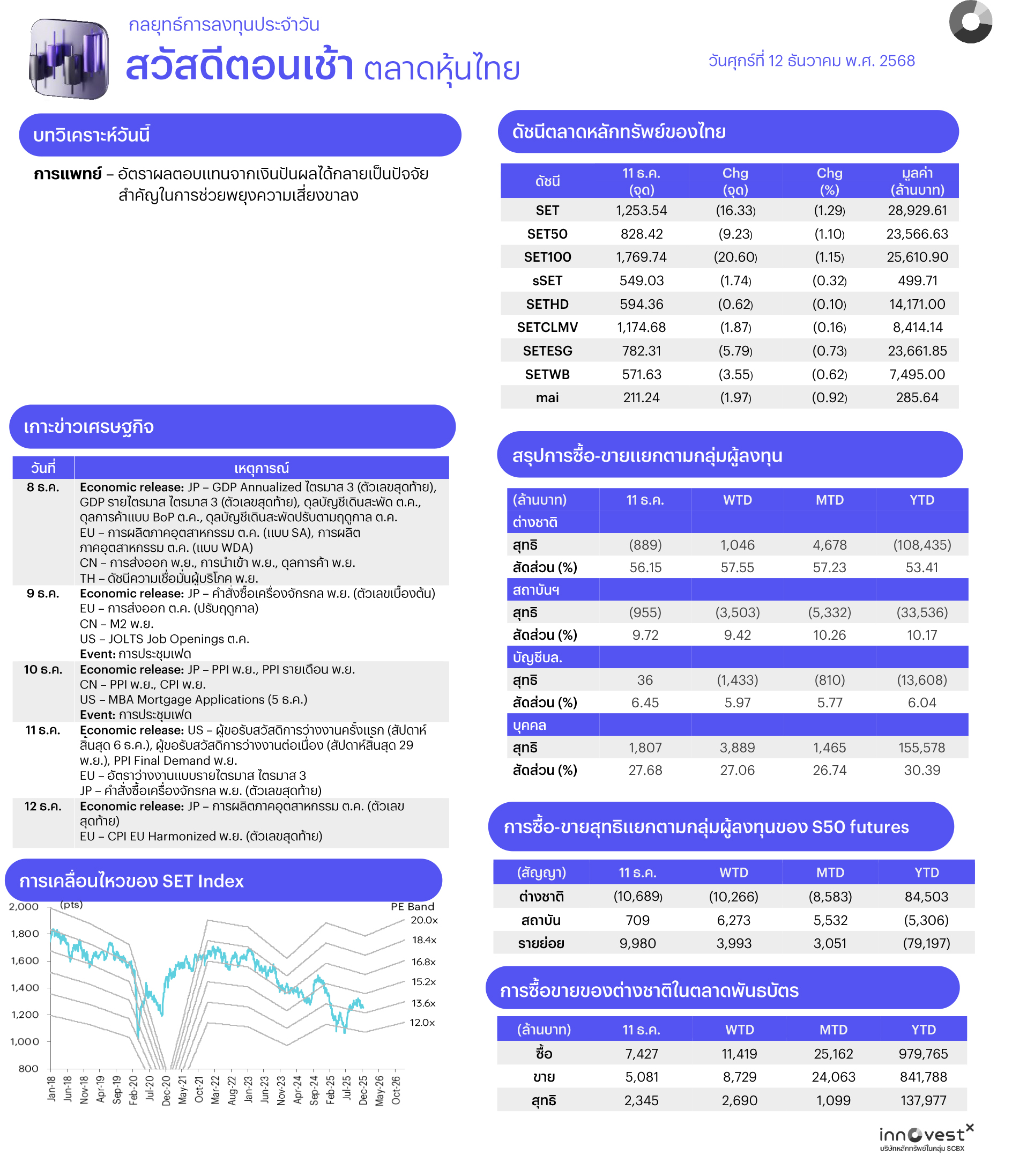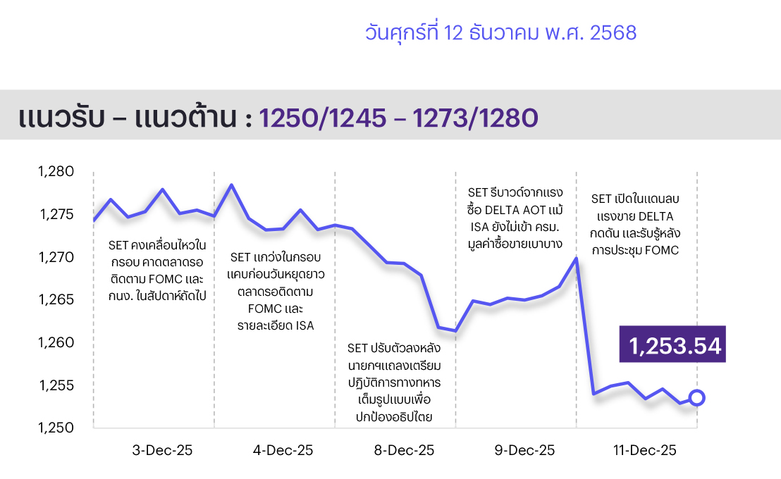 ช่วงสั้นมอง SET แกว่งตัวไซด์เวย์ในกรอบ 1250-1280 จุด ระหว่างรอปัจจัยชี้นำใหม่ ทั้งนี้ปัจจัยสำคัญติดตาม ได้แก่ ผลประชุมนโยบายการเงินของเฟด (11 ธ.ค.) ซึ่งล่าสุดเฟดปรับลดดอกเบี้ยนโยบาย 25bps สู่ระดับ 3.75% ตามตลาดคาด ขณะที่ Dot Plot ส่งสัญญาณปรับลดอัตราดอกเบี้ย 0.25% จำนวน 1 ครั้งในปี 2569 และปรับเพิ่ม GDP สหรัฐฯ ปี 2569 เป็น 2.3% จากระดับ 1.8% ขณะที่ในประเทศติดตามไทม์ไลน์วันเลือกตั้งและการเดินหน้าสู่การจัดตั้งรัฐบาลใหม่ หลังเมื่อคืนนี้นายกรัฐมนตรีอนุทินประกาศยุบสภาและล่าสุดวันนี้มีโปรดเกล้าฯ พ.ร.ฎ. ยุบสภาแล้ว ดังนั้นกลยุทธ์ลงทุนจึงแนะนำให้ “Selective Buy”