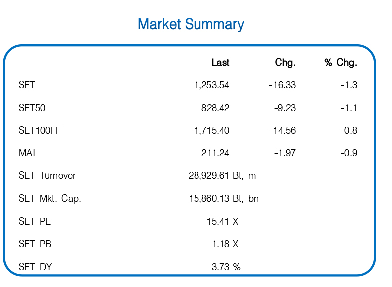 ทยอยสะสม-ตั้งรับ – แม้ SET เสี่ยงหลุด 1250 ระยะสั้น แต่มองเป็นจังหวะตั้งรับ-ทยอยสะสมที่เรา Wait&See ในช่วงก่อนหน้านี้ มอง Downside จำกัด มีเป้าที่ 1220-30