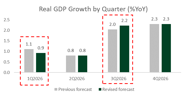 สำหรับผลกระทบทางเศรษฐกิจ การยุบสภาเกิดเร็วกว่าที่ศูนย์วิจัยกสิกรไทยคาดไว้ราวครึ่งเดือน ซึ่งไม่ได้เปลี่ยนภาพรวมของเศรษฐกิจไทยปี 2569 โดยยังคงประมาณการเศรษฐกิจไทยปี 2569 ที่ 1.6% (รูปที่ 1) การเบิกจ่ายงบประมาณปี 2569 และโครงการที่ได้รับอนุมัติแล้วสามารถดำเนินต่อได้ ขณะที่งบกลางที่เหลือราว 5 หมื่นล้านบาท ได้ถูกนำไปรวมในประมาณการเศรษฐกิจแล้ว อย่างไรก็ดี การใช้จ่ายอาจล่าช้าออกไป และลักษณะการใช้จ่ายอาจเปลี่ยนแปลงตามแนวทางของรัฐบาลใหม่ที่จะเข้ามาบริหารต่อไป ส่งผลให้คาดว่า GDP ไทยในไตรมาส 1/2569 มีแนวโน้มขยายตัวชะลอลงจากที่ประเมินไว้เดิม เนื่องจากขาดแรงหนุนจากมาตรการกระตุ้นเศรษฐกิจ โดยเฉพาะโครงการคนละครึ่งพลัส เฟส 2 ซึ่งเดิมรัฐบาลตั้งใจจะเริ่มในช่วงต้นปีหน้า อย่างไรก็ตาม คาดว่างบค้างใช้จะถูกนำมาใช้หลังจากมีรัฐบาลใหม่ในช่วงไตรมาส 3/2569 ส่งผลให้เศรษฐกิจในไตรมาส 3/2569 อาจขยายตัวสูงกว่าคาดการณ์เดิม ขณะที่ภาพรวมทั้งปี 2569 ยังคงประมาณการการเติบโตของ GDP ไว้ที่ 1.6% ตามเดิม (รูปที่ 2)