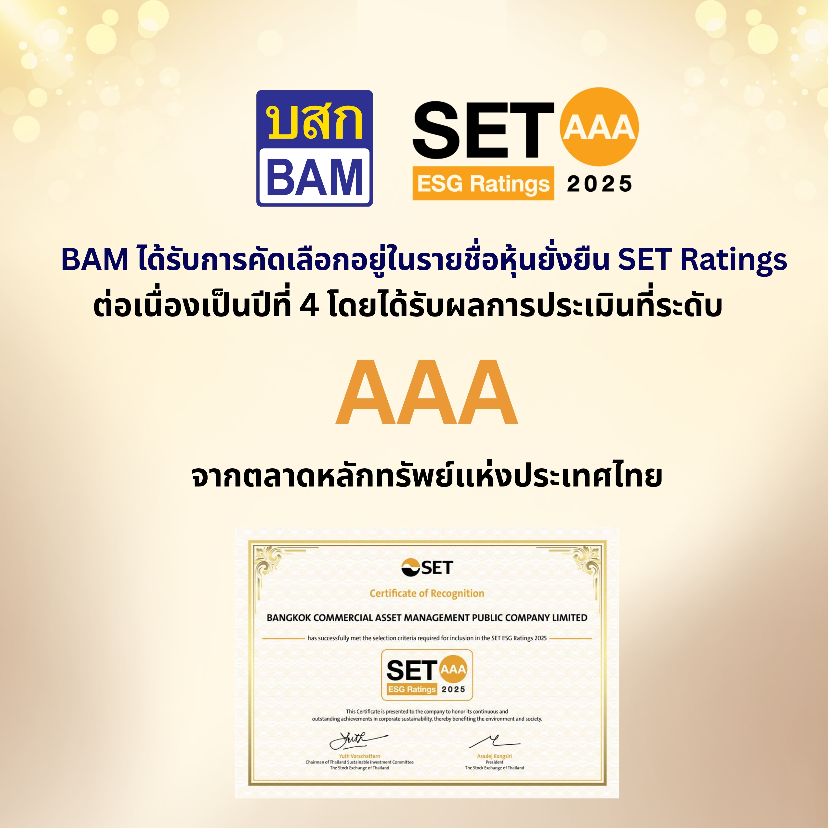ดร.รักษ์ วรกิจโภคาทร ประธานเจ้าหน้าที่บริหาร BAM เปิดเผยว่า BAM ได้รับผลประเมินหุ้นยั่งยืน SET ESG Ratings ระดับ “AAA” ในกลุ่มธุรกิจการเงิน (Financials) จากการประกาศผลประเมินหุ้นยั่งยืน SET ESG Ratings ประจำปี 2568 ของตลาดหลักทรัพย์แห่งประเทศไทย สะท้อนให้เห็นถึงความมุ่งมั่นในการดำเนินงานของบริษัทฯ ที่ให้ความสำคัญต่อการดำเนินธุรกิจอย่างยั่งยืน ยกระดับการดำเนินงานภายใต้กรอบ ESG ครอบคลุมในทุกมิติ ทั้งด้านสิ่งแวดล้อม สังคม เศรษฐกิจและการกำกับดูแลกิจการ โดยคำนึงถึงผู้มีส่วนได้เสียทุกภาคส่วน ตอบสนองวิสัยทัศน์ “เป็นองค์กรหลักในการพลิกฟื้นสินทรัพย์เพื่อช่วยขับเคลื่อนเศรษฐกิจและสังคมไทยให้เติบโตอย่างยั่งยืน” และแสดงให้เห็นถึงศักยภาพการเติบโตขององค์กรในระยะยาว