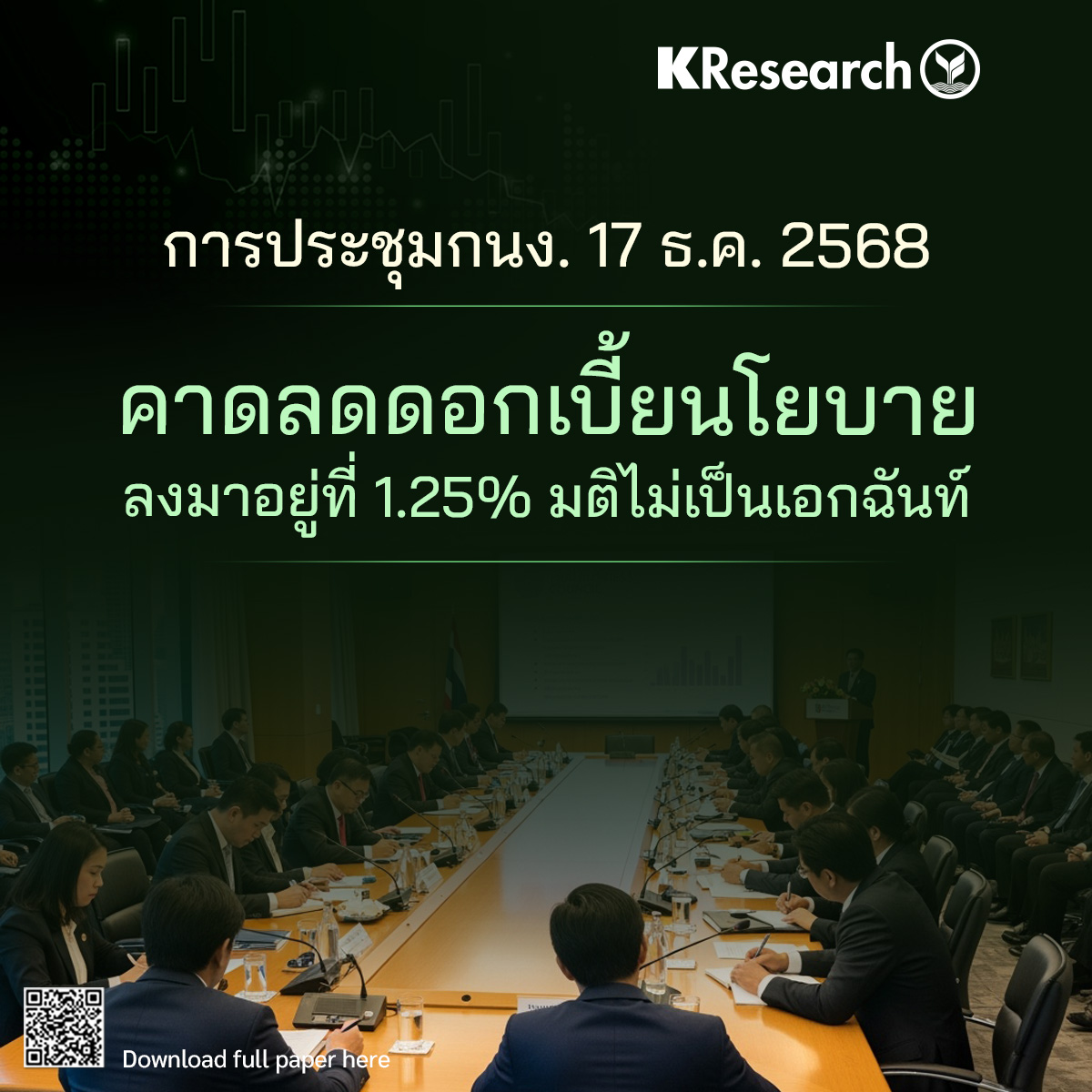 ศูนย์วิจัยกสิกรไทยวิเคราะห์ "การประชุม กนง. 17 ธ.ค. คาดลดดอกเบี้ยนโยบายลงมาอยู่ที่ 1.25% มติไม่เป็นเอกฉันท์"